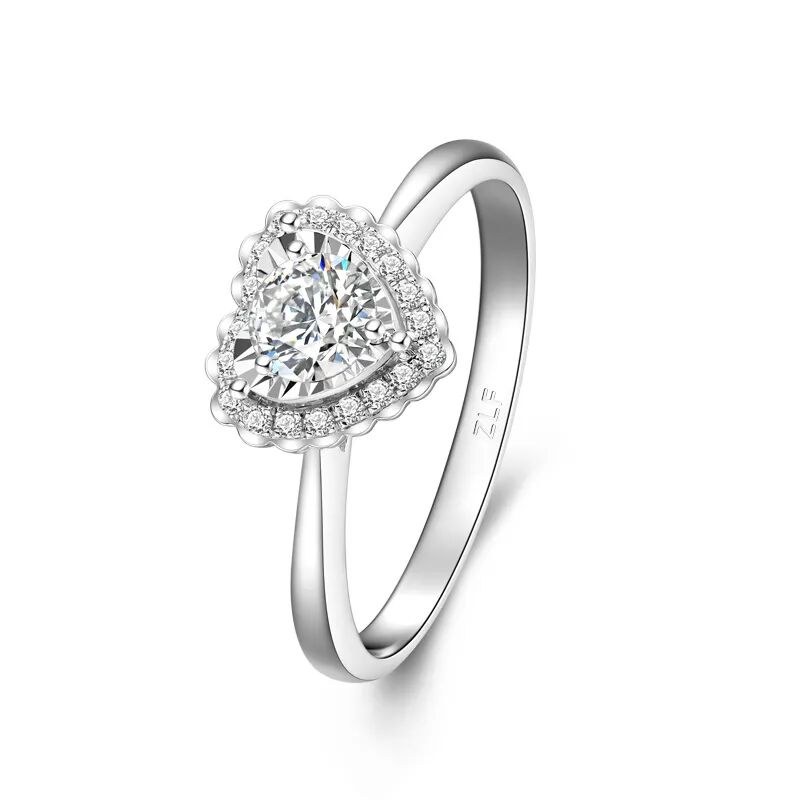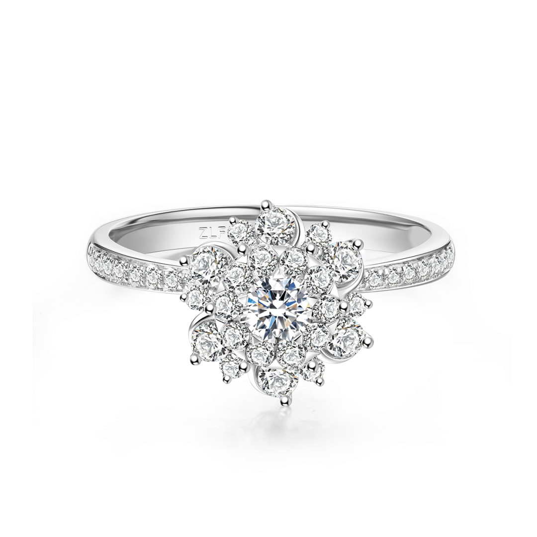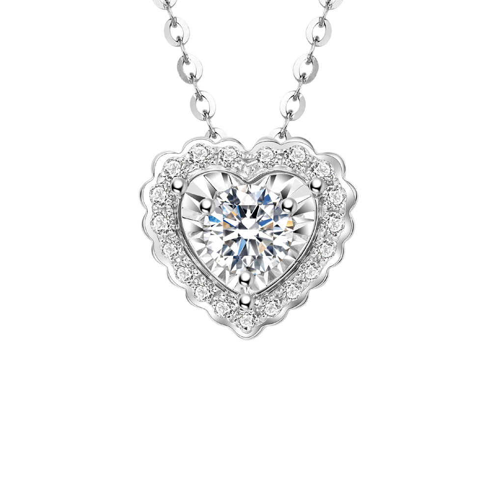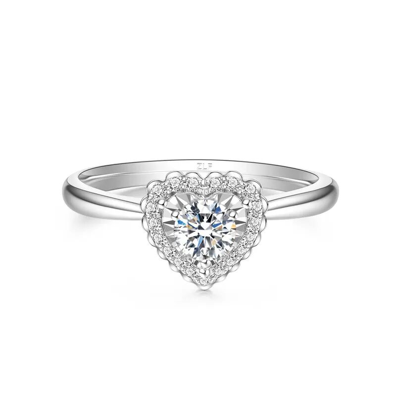 以几何图形中的心形来设计,波浪曲线围成一颗心形,镶满小钻,表达浪漫的爱意,中间主钻以“心形车花片”镶嵌,层次丰富,造型简约耐看。