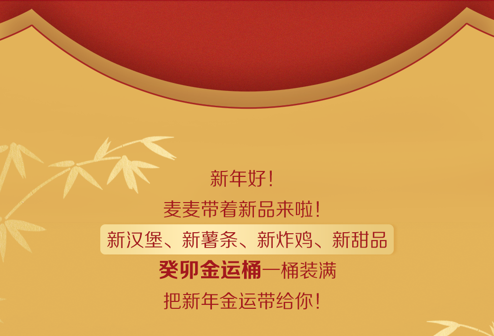 黑椒风味脆汁鸡、麦辣鸡翅产品中可能含有骨头,品尝时请您留意。黑椒风味脆汁鸡产品中含蚕豆粉等调味料。癸卯金运桶内包含:黑椒风味脆汁鸡(鸡腿)(1块)+麦辣鸡翅(2对)+那么大鸡排(1块)+脆脆薯条(1份)+麦辣鸡腿汉堡(1个)+板烧鸡腿堡(1个)+节节高酸笋风味板烧鸡腿堡(1个)+肉酱安格斯厚牛堡(1个)+红豆年糕风味派(2个)+可口可乐(中)(4杯)。