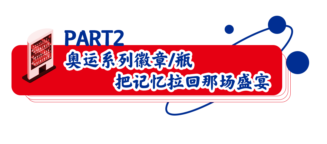 “奥运日志纪念章”,集齐17枚可组成可口可乐经典弧形瓶的造型;北京奥运会可口可乐汉字中国拼图徽章,在奥运历史上留下深刻的“中国”印记……