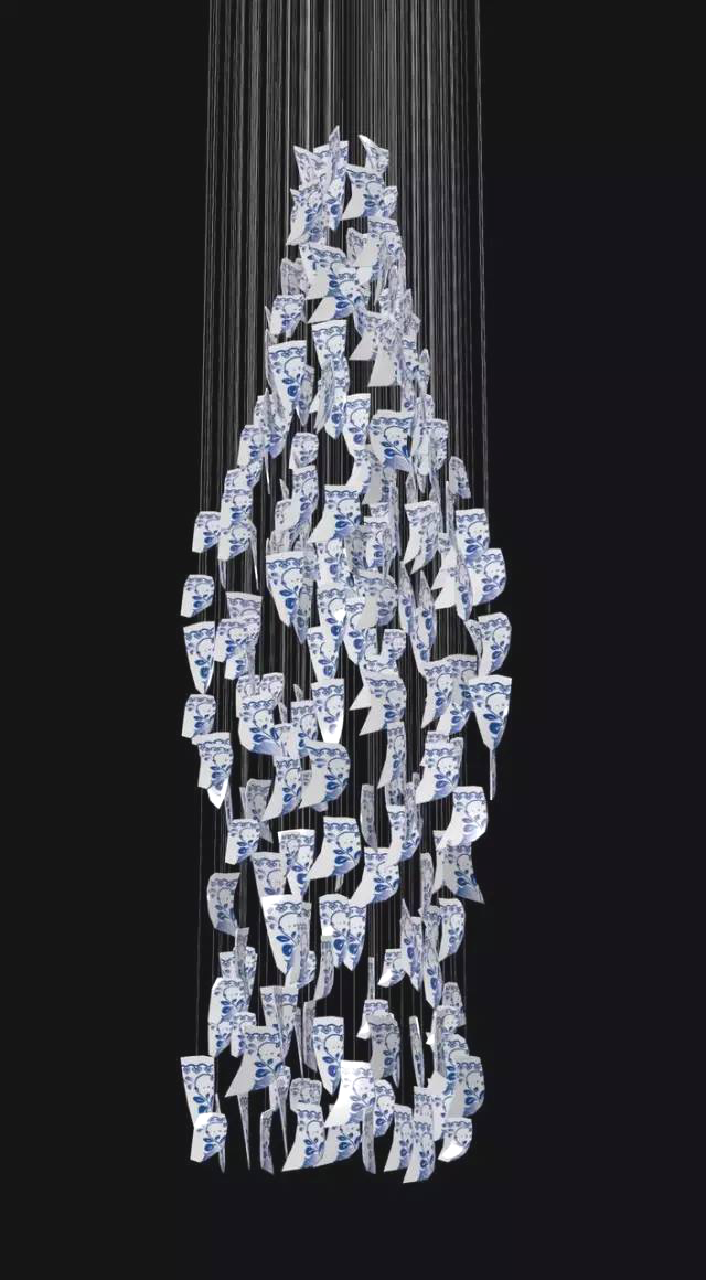 用陶瓷烧制而成,之后按照比例敲碎成150片碎片,最后再用坚韧不断的鱼丝错落不一的垂吊在展示台内,组成可口可乐瓶子形状。