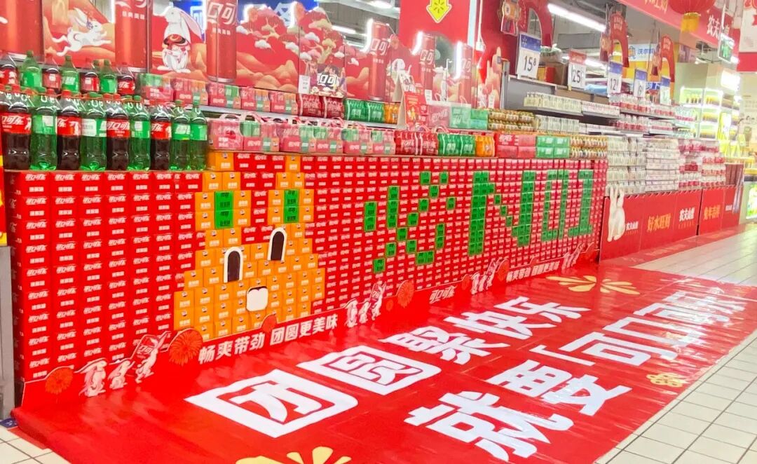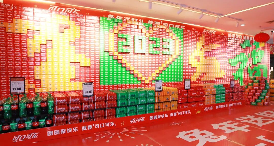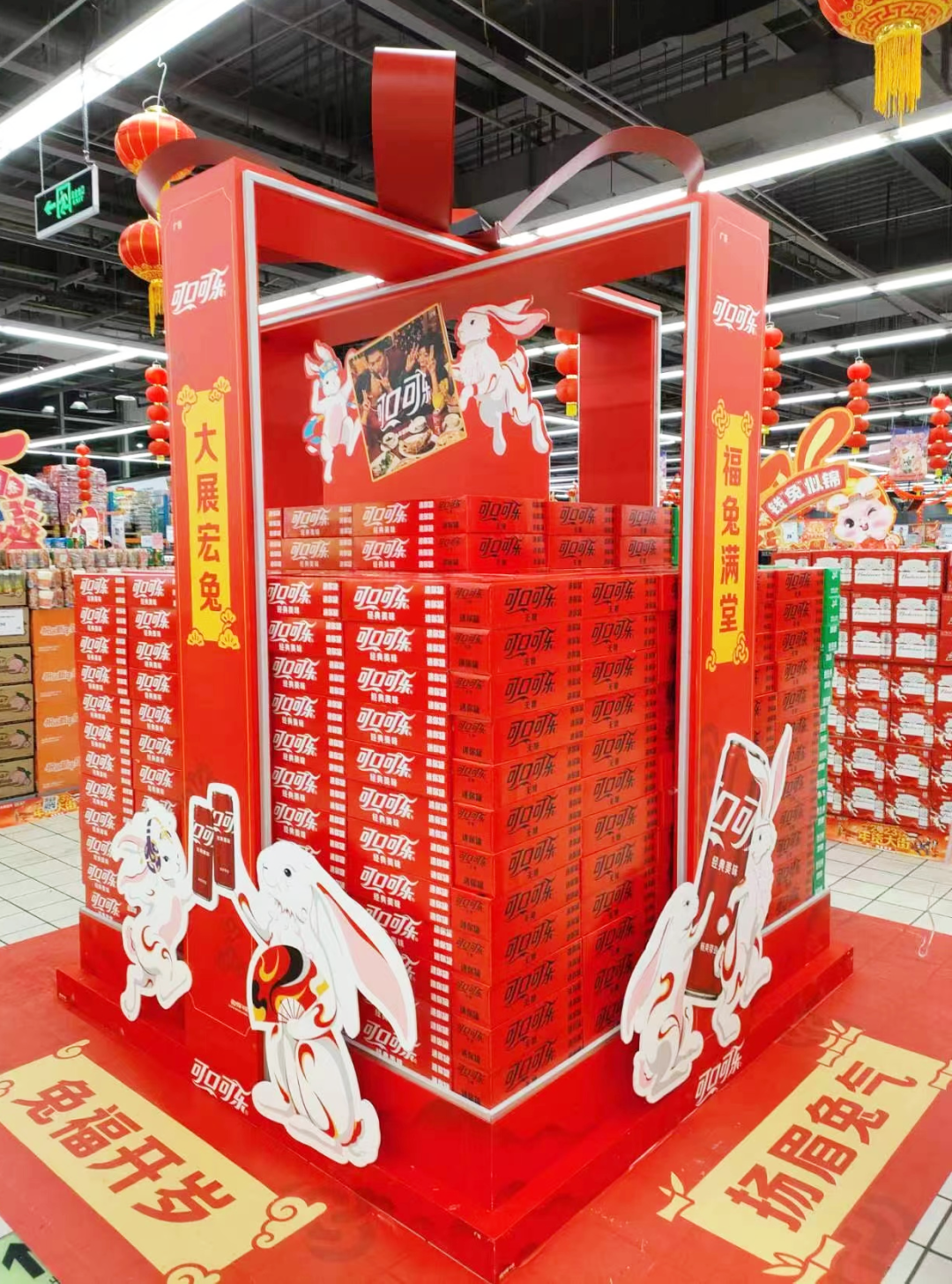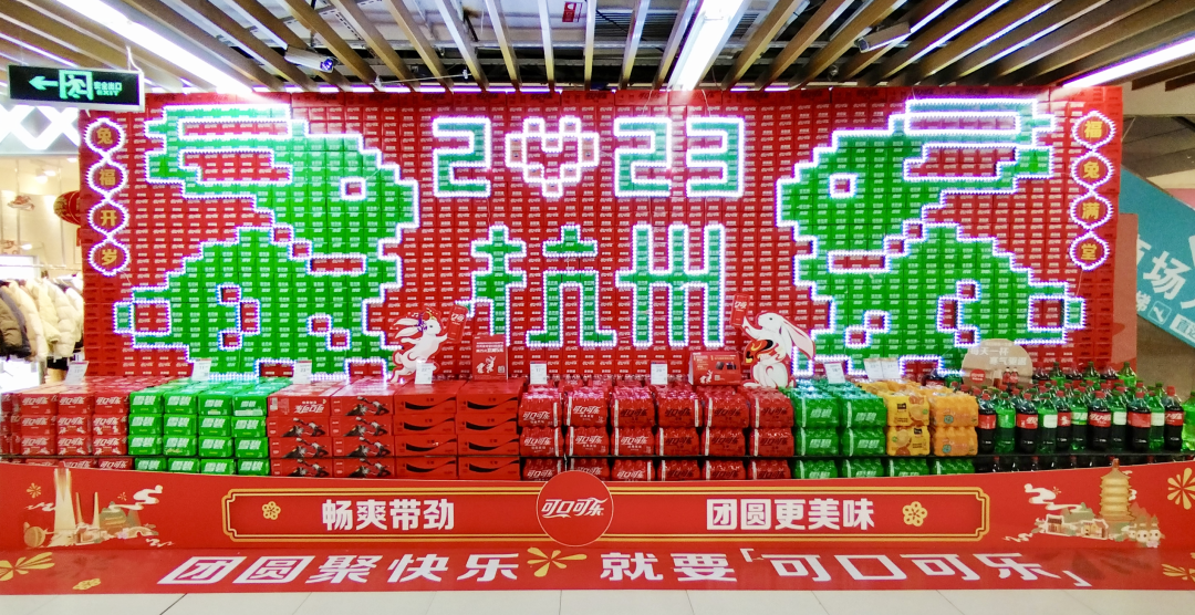 由1000多箱饮料打造的兔年地堆把“兔飞猛进”的美好祝愿带给更多消费者。囤货送祝福趁现在,最丰富的饮料配齐法,可口可乐堆头为你的心意支招!