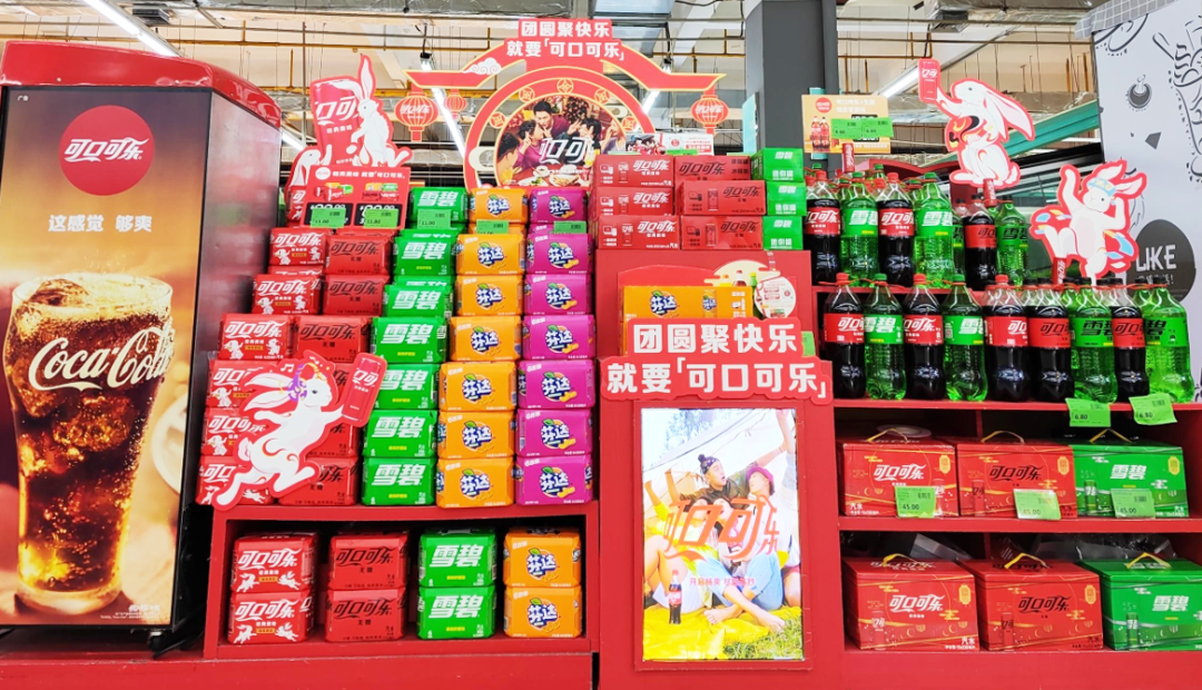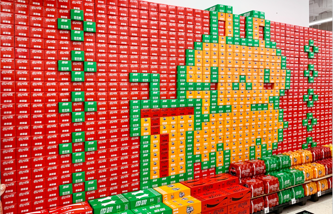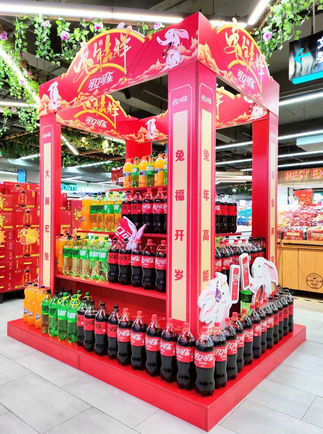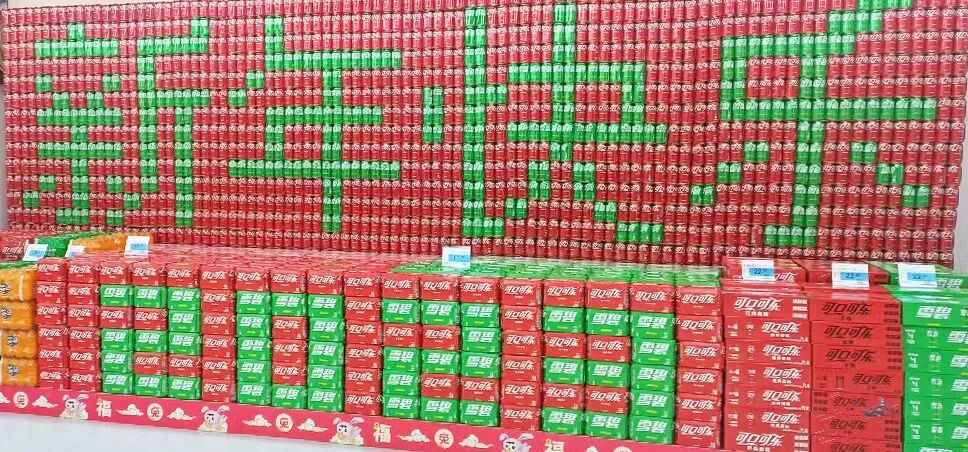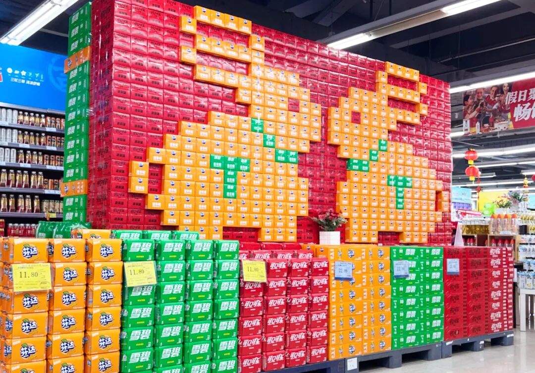 由1000多箱饮料打造的兔年地堆把“兔飞猛进”的美好祝愿带给更多消费者。囤货送祝福趁现在,最丰富的饮料配齐法,可口可乐堆头为你的心意支招!