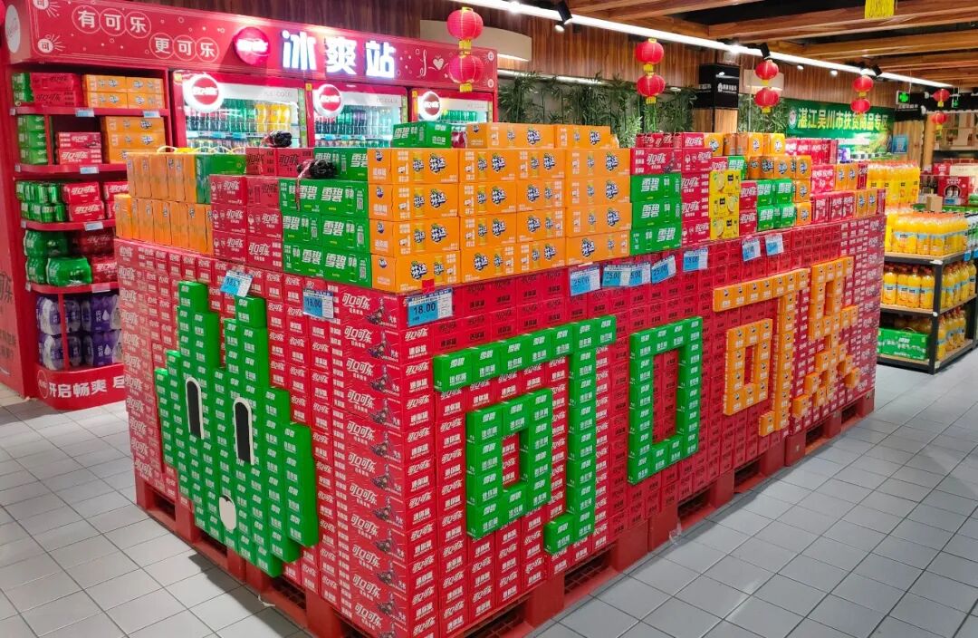 千箱造型堆大气美观,一下将过年氛围感拉到最满!醒目生动、诚意满满的可口可乐堆,你要马上拎几件回家和家人一起分享快乐吗?