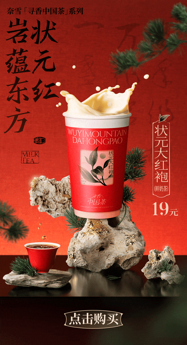爸爸的大红袍 有着制茶人的道道匠心 更寄托着对女儿平安顺遂的殷切期许 大红袍的民谣在武夷人的耳畔回响 奈雪「寻香中国茶」也来到今年的最后一站 奈雪 「寻香中国茶」系列 状元大红袍鲜奶茶 好茶好奶,成就状元红 名门状元 大师监制 刘安兴 国家一级评茶技师 大红袍制作技艺非遗传承人 十三道工艺,以规矩,制好茶 从采摘到加工,道道工序精湛细致 得以成就大红袍独一无二的香、清、甘、活 正季头春头采 以“三叶中开面”标准采青法采摘 不过嫩不过老 ,醇香更为持久 看青做青 反复摇青和静置发酵 以控制茶叶内物质进行转化 是形成岩茶香味的基础 以火调香,以火调味 中火长时间的慢焙和复焙 以提升和稳固茶的香气 形成武夷岩茶的独特风味 武夷峭壁 岩骨花香 岩岩有茶,非岩不茶 武夷山温润的气候 丰富的土壤层次和微量矿物 为茶树的生长提供了绝佳的环境 于武夷峭壁之上,恰似绝处逢生 吸收山野力量,厚积薄发 焙火淬炼,成就沉稳的岩韵 高扬兰香交织熟果香,又显细腻浪漫 滋味层次丰富,历泡如新 上乘鲜奶 香辅香成 奈雪×悦鲜活 采用悦鲜活优质鲜牛奶 奶香纯净,口感鲜甜 与大红袍的茶韵相得益彰 严格限定牧场奶源 层层把关,风味稳定 0.09秒超瞬时杀菌锁鲜 保留更多活性蛋白,让牛奶更好喝 乳铁蛋白 α-乳白蛋白 β-乳球蛋白 每100ml鲜牛奶含3.6g优质蛋白质 焙火咖香 沉醇出新 状元大红袍 茶咖 中式传统茶与西式咖啡相遇 不同的焙火醇香碰撞 在茶的岩韵与花果香的基础上 更添一份浓郁坚果香 于这一杯里慢下来 细细品味时间的味道 寻香中国茶的下一站,你希望喝到什么香?