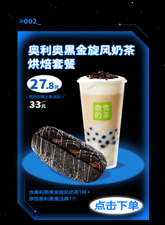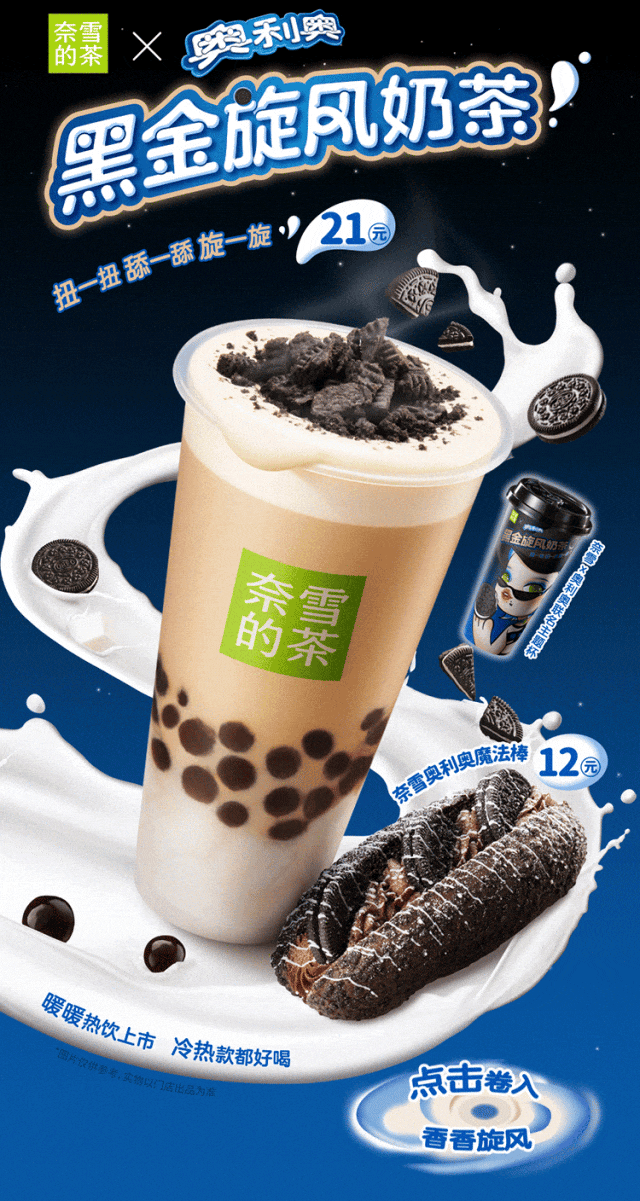 2023.11.21 随奈雪女孩漫游无垠宇宙,探索美味之源 注意前方!黑金旋风来袭!请勿点击 嘭!奥利奥被旋风击碎 分裂无数碎块 香脆力量爆发 恭喜!意外收获美味之源——黑奥碎 将黑奥碎卷入金色山脉茶的洪流之中,奇香将惊艳宇宙 奈雪×奥利奥 奥利奥黑金旋风奶茶 21元 扭一扭 舔一舔 旋一旋 0香精 0奶精 超多料 超暖心 脆香 黑奥碎芝士奶盖 蜜香 经典金色山脉茶 奶香 悦鲜活优质鲜牛奶 黑糖香 黑珠珠 米乳香 手作米布丁 观测1 黑奥碎 香脆爆发 111年来,无数美味探索家为奥利奥着迷 100%进口可可粉制作 可可粉由可可豆加工,0可可香精 扭一扭,舔一舔,泡一泡 每一粒饼干分子,都饱含人类的情感记忆 经典被重构,奥利奥升级为黑奥碎流星雨 洒向芝士海,香香脆脆,微咸奶香交织奥巧香 观测2 金色山脉 高香迷雾 选用茗茶福建宁德金牡丹与云南滇红拼配 揉捻、揉切、全发酵工艺除去苦涩 彻底激发红茶的鲜香与甜醇 涓涓茶汤灿若日照金山 高香打破时间界限,嵌入记忆,闻过难忘 前调 花香酣畅,若有花儿停歇衣角发梢 中调 桂圆果香,温厚的柔甜渗过口齿 后调 焦糖蜜香,细密的甘醇轻抚心绪 观测3 悦鲜活鲜奶 瞬时锁鲜 好茶配鲜奶,自然更清甜 采用悦鲜活优质鲜牛奶,奶纯!味鲜!严格限定牧场奶源,层层把关,风味稳定 0.09秒超瞬时杀菌锁鲜 鲜奶保留更多活性蛋白 活性乳铁蛋白 β-乳球蛋白 α-乳白蛋白 观测4 好料 多重宇宙 黑珠珠 大颗珠珠,黑糖风味,软糯Q弹 手作米布丁 弹嫩细滑,米乳香四溢 黑白碰撞,duang来duang去 在味觉的多重宇宙激发奇妙共振 喝法报告 完成观测,解码香香喝法报告 ①扭一扭 扭一扭,扭开订制奈雪杯盖 ②舔一舔 先尝黑奥碎芝士奶盖 请留意,可能让你长白胡子!③旋一旋 旋风搅拌,暴风吸入 真香警告,小心10秒炫光!奥巧星球 奥利奥魔法棒 面包软韧,巧香奶油丝滑 饼干咔嚓脆爽,层次丰富 12元 奥利奥布蕾小贝 蛋糕胚如云松软 布雷夹心入口即化 15.8元 2个装 奈雪8周年 第二波福利 宇宙宝贝展览 01 限定 联名主题杯 联名手提袋 购奥利奥黑金旋风奶茶赠送,数量有限,赠完即止 *因海南当地限塑政策影响,海南地区无主题杯,使用专属限定杯贴哦。02联名主题店 打卡主题店,扭一扭,扭出幸运 用户到店购买「奥利奥联名系列产品」2份(饮品或烘焙),凭小票领取扭蛋币,单笔订单可获得1次扭蛋机会。联名奶茶、烘焙、奥利奥饼干等你来抽!*兑换方式:用户到店凭当日在本店购买产品的小票领取1枚扭蛋币,扭蛋后所抽中奖品,凭券至店员处兑换相应礼品。深圳龙华壹方天地店 上海静安万象天地店 奥利奥玩法变幻无穷,香脆始终如初 奶茶也能千变万化,奈雪坚持鲜奶配好茶 奈雪与奥利奥玩在一起 变奶茶,变烘焙,卷起黑金旋风好香好玩!