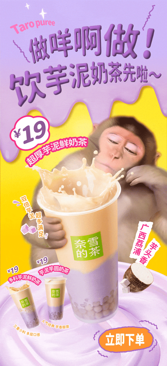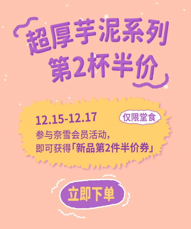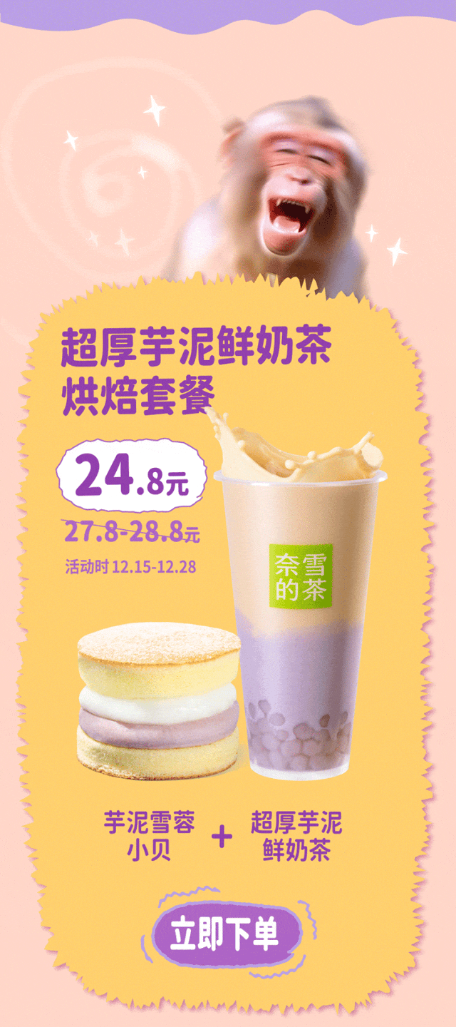 强降温来袭,冷鼠吗喽了!喝杯奈雪,温暖吗喽 工作永远做不完,喝杯奈雪解解馋 猴儿有泪不轻弹,奈雪一喝又是好汉 鱼哭了水知道,吗喽冷了奈雪知道 吗喽甄选广西荔浦芋头,质朴芋香 荔浦槟榔芋 国家地理标志产品 得天独厚的地理优势 造就槟榔芋的独特口感 酥松、粉糯、绵密 芋香质朴醇厚 双倍厚芋泥 “芋”罢不能 槟榔芋高温蒸煮后捣碎成泥 保留软糯芋头丁的颗粒感 敦厚扎实 吸得到的甘甜粉糯 尝得到的绵密芋香 吗喽强推金色山脉红茶,甜醇茶香 福建宁德金牡丹与云南滇红多次调配制成 揉捻、揉切、全发酵工艺除去苦涩 更显红茶的温厚与醇香 前调 花香翩然,幽幽掠过鼻尖,柔情动人 中调 蜜韵高扬,裹挟了山野的清香,清鲜悠长 后调 果香浓郁,温厚饱满滑入喉中,回味甜香 吗喽优荐悦鲜活鲜奶,自然奶香 悦鲜活鲜奶 瞬时锁鲜 好茶配鲜奶,自然更清甜 采用悦鲜活优质鲜牛奶,奶纯!味鲜!严格限定牧场奶源,层层把关,风味稳定 0.09秒超瞬时杀菌锁鲜 保留更多活性蛋白 乳铁蛋白 α-乳白蛋白 β-乳球蛋白 吗喽超爱,多料大满足 小芋圆弹润软糯,芋香绵绵 燕麦软糯香甜有嚼劲,麦香馥馥 馅入超厚芋泥中 一杯多料,多重口感 ①超厚芋泥鲜奶茶 19元【主推】 双倍芋泥,超多满足 ②多料芋泥鲜奶茶 19元【新品】 三重小料,多层口感 ③芋泥芋圆奶茶 19元【经典】 人气经典,芋香醇厚 超厚芋泥系列 第2杯半价 12.15-12.17 参与奈雪会员活动,即可获得「新品第2件半价券」 点击下单 吗喽限定周边 购超厚芋泥系列奶茶 赠限定贴纸及杯贴 *杯贴款式随机,贴纸数量有限,赠完即止 超厚芋泥鲜奶茶烘焙套餐 超厚芋泥鲜奶茶+紫薯芋泥双料包/芋泥雪蓉小贝 一人一句“吗喽语录” 评论区抽15位喝超厚芋泥鲜奶茶 CC 阿爽 小华 邱月