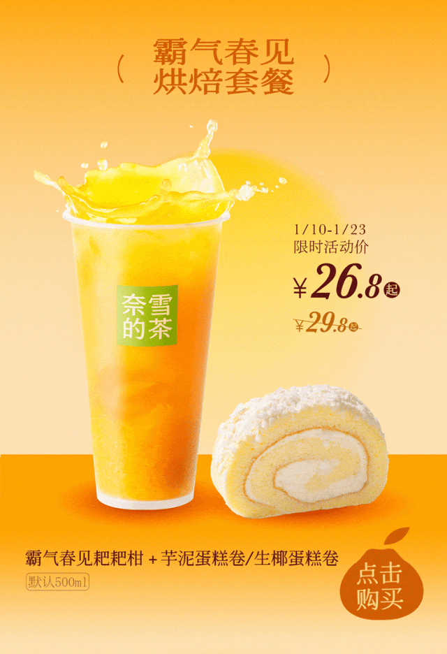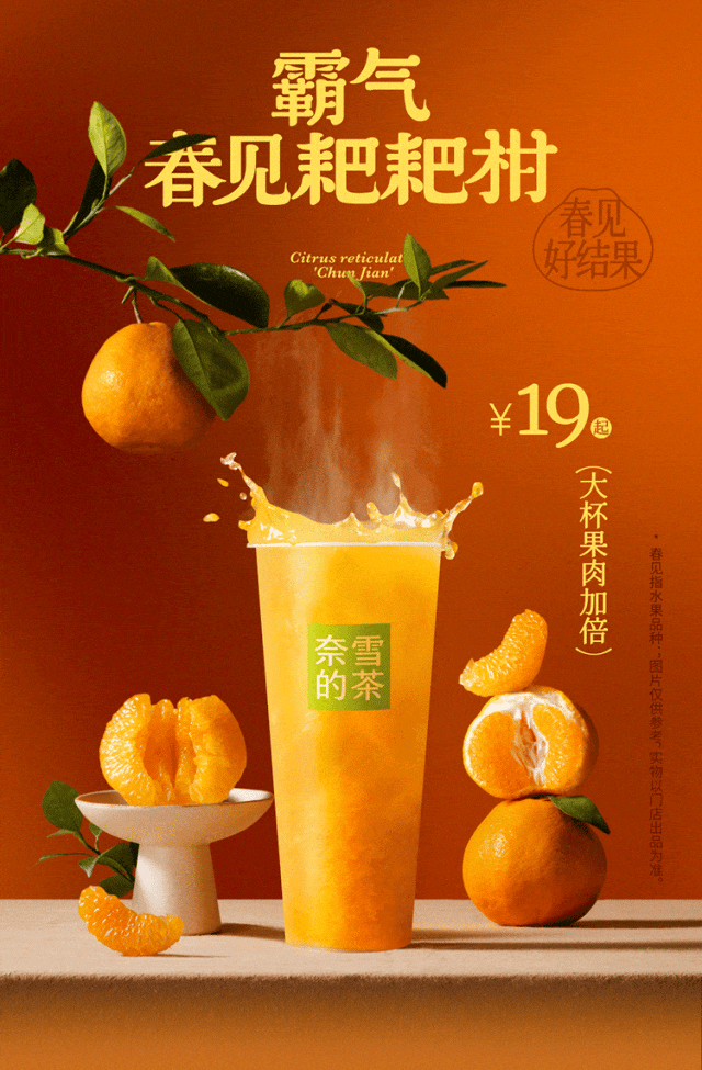 新年望顺遂 春见好结果 点击接好果 春见 · 耙耙柑( pá pá gān ) 新年伊始,隆冬跟着抵达, 一种橘子,偏偏选这个季节结果, 它的名字说明一切。春见耙耙柑,愿你提前见到春天, 春天的温暖、新生, 春天的一切好结果。新年开个好“橘” 霸气波波橘 升级 霸气春见耙耙柑 _____________________________________________________________________ 霸气春见耙耙柑 19元起 大杯果肉加倍 _____________________________________________________________________ 好果子 · 优质当季耙耙柑 外皮耙 “耙”即软,耙耙柑成熟后,果皮果肉分离中空,外皮越软,果肉保留越多水分 皮璧薄 果粒大 味道甜 饱满果肉会撑破白衣薄膜露出 轻轻一撕,便能弹出大粒“爆珠” 有枝有叶送到店 保留新鲜的自然橘香 无渣无皮放入杯 保留完整果粒的爆汁口感 颗颗用心手剥 咬破饱满的大颗果粒 嘭,嘭,嘭—— 汁水如烟花层层爆发在嘴里 口感比橙细腻,味道比柑甘甜 大橘又大粒 爆汁炸弹 大升级 · 大杯果肉2倍 果肉一次喝个爽,上新大杯规格!650ml大杯果肉含量≈2×500ml常规杯果肉含量 金奖茶 · 茉莉初雪 每一斤茶用上万朵新鲜横州茉莉花,窨制八次 云南高山大白毫,拼配四川雅安绿茶做底 茉莉初雪激发更鲜灵的橘香 搭配爽滑茉莉茶冻,清香层层绽放 *2020年全国茉莉花质量推选比赛 金奖 *2023年茉莉花茶产品质量 四星产品 三重香 · 自然香 前调 鲜橘香如春风拂面 中调 果肉粒粒爆破出甘冽清香 后调 茉莉香幽幽盛放 热着喝更香 热乎的橘香,顺着着鼻尖将你包围 暖和、安心,是它赠予你的新年礼物 _____________________________________________________________________ 新年开个好“橘” 霸气春见耙耙柑 奈雪点单小程序会员价 常规杯19元 大杯23元 限量赠主题杯贴 点击开橘 霸气春见烘焙套餐 29.8元起 1.10-1.23活动价26.8元起 霸气耙耙柑(默认500ml)+芋泥蛋糕卷/生椰蛋糕卷 点击购买 _____________________________________________________________________ 春见好结果 愿见到春日安好,往后尽是鲜花烂漫 愿见到开年好“橘”,往后一整年事事顺心 新年开好“橘” 你希望————?留言抽10位,请喝新年大好橘!