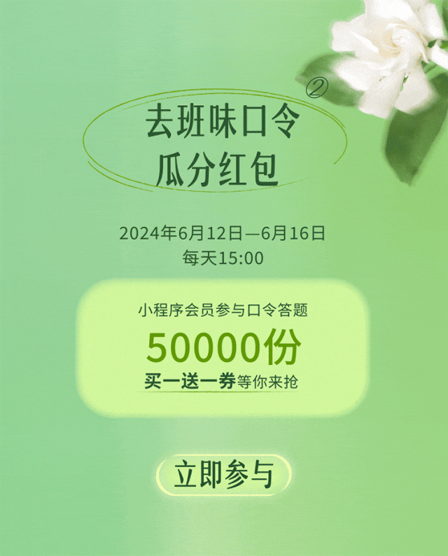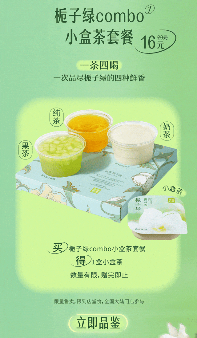 原来是栀子花呀 夏天来时,在街头巷尾总能被栀子花的清丽幽香吸引,带着初夏青涩的绿意,水灵灵的,像是一道爽冽的风。栀子也总是开得大大方方,香得痛痛快快。如同四川人天生豪爽自在的松弛感,栀香亦是浓郁且直接。当栀子遇上雅安绿茶,便愈加馥郁鲜爽,沁人心脾。初夏之际,奈雪携 夏日香水茶系列之栀子绿 邀你一起安逸喝茶 *“香水”仅指茶底香气,非原料品种 花香茶骨,鲜灵清扬 0香精 四川雅安烘青绿茶 层层叠叠浸染 积蓄饱满栀香 反复多次,只待花香融入茶骨 藏下栀子的鲜灵清扬 不见花影,但闻栀香 冲泡顷刻,花香释放 犹如在杯中重开了一次 带着初夏清透的绿意 幽甜鲜爽 钻进鼻尖,滑进喉间 栀子绿combo 一茶三喝 饮茶新体验 香水栀子绿:栀香高爽幽甜 霸气栀子蜜瓜:瓜肉甜蜜,栀香鲜爽 栀子绿奶茶:甘醇奶香融合清冷茶韵 栀子绿小盒茶 精选每年最佳花期的四川牡丹栀子 栀气高爽浓烈 细窨独有春夏鲜爽的雅安烘青茶 汤色晶莹沁绿,香韵幽甜冷冽 *更多小盒茶可在奈雪门店购买:九窨茉莉龙毫、大红袍乌龙茶、金色山脉 霸气栀子蜜瓜 前调:蜜瓜甜润 中调:栀香浓郁 尾调:绿茶爽冽 优选山东网纹蜜瓜 果肉如翡翠般透蜜甜软 与沁雅清爽的栀子绿交织 猛吸一口 舌尖都裹上甜润的花果香 栀子绿奶茶 前调:栀香清灵纯净 中调:奶香饱满甜醇 后调:绿茶悠然清逸 香醇牛奶与栀子绿碰撞交融 温润化开栀子绿的清冷 更添一份柔和细腻 口感也丰厚饱满起来 栀子绿combo小盒茶套餐 16元 一茶四喝 一次品尽栀子绿的四种喝茶 买栀子绿combo小盒茶套餐 得1盒小盒茶 数量有限,赠完即止 限量售卖,限到店堂食,全国大陆门店参与 去班味口令 瓜分红包 2024年6月12日—6月16日 每天15:00 小程序会员参与口令答题 50000份买一送一券等你来抢 文末互动 你的栀子花记忆是什么?请 20 位“栀己”喝霸气栀子蜜瓜