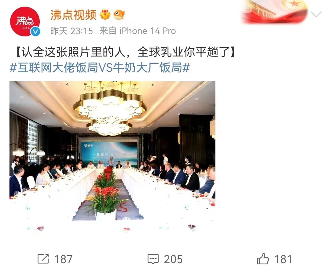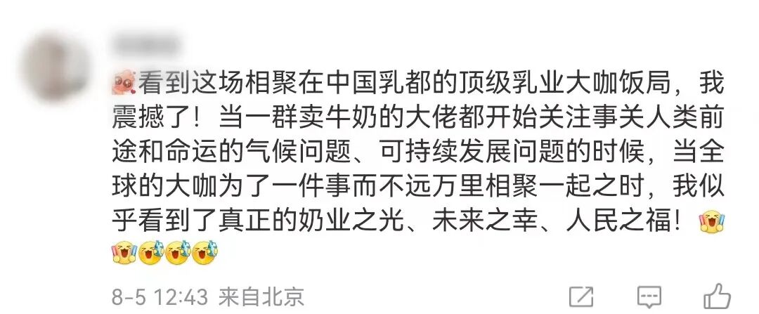 在给@蒙牛乳业微博的众多留言中,奶思看到一位粉丝这样说道,看到这场相聚在中国乳都的顶级乳业大咖饭局,我震撼了!当一群卖牛奶的大佬都开始关注事关人类前途和命运的气候问题、可持续发展问题的时候,当全球的大咖为了一件事而不远万里相聚一起之时,我似乎看到了真正的奶业之光、未来之幸、人民之福!