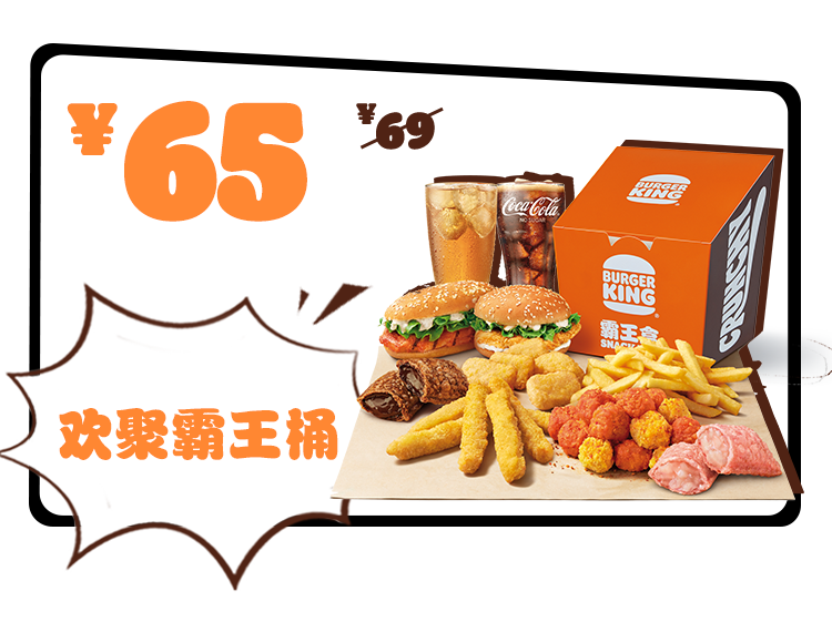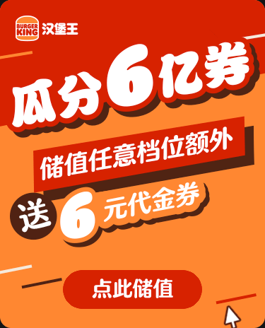 *非外卖渠道价格解释:图示如有划线价格,并非指原价,而是指不参加优惠活动情况下该产品在汉堡王指定门店销售的常规价格(或者指其中所含单品的常规单买价总和)。除非图示另有解释,否则图示如有节省的金额或折扣比例,是与不参加优惠活动情况下在汉堡王指定门店单独购买该产品的常规价格(或者其中所含单品的常规单买价总和)相比较。若需要查询当前门店销售的常规价格,可查看相应门店菜单或详询店员。