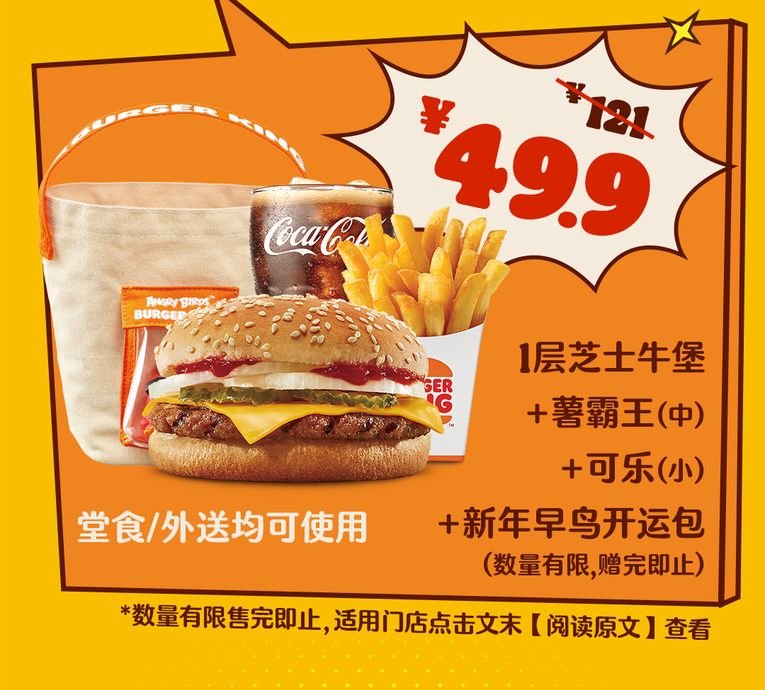 *非外卖渠道价格解释:图示如有划线价格,并非指原价,而是指不参加优惠活动情况下该产品在汉堡王指定门店销售的常规价格(或者指其中所含单品的常规单买价总和)或汉堡王门店建议零售价。除非图示另有解释,否则图示如有节省的金额或折扣比例,是与不参加优惠活动情况下在汉堡王指定门店单独购买该产品的常规价格(或者其中所含单品的常规单买价总和)或汉堡王门店建议零售价相比较。若需要查询当前门店销售的常规价格,可查看相应门店菜单或详询店员。