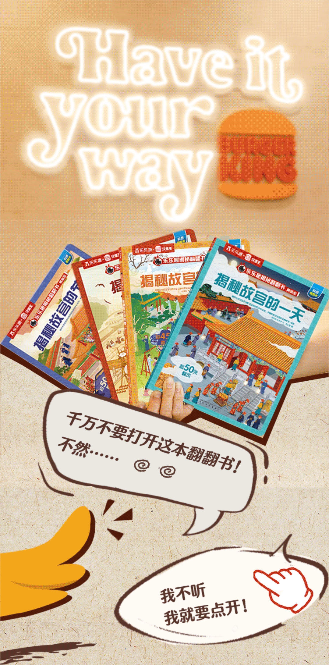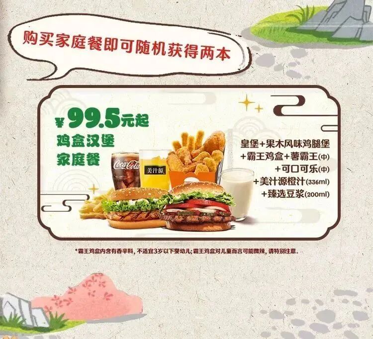 *免费图书及其包装请以实物为准。即日起至2023年2月19日,在中国大陆部分汉堡王餐厅(少量交通枢纽以及不售卖儿童餐的门店除外)购买小小国王套餐有机会获赠乐乐趣揭秘故宫系列精编版翻翻书(揭秘故宫系列精编版翻翻书共4件(《揭秘故宫的前世今生》、《揭秘故宫的节庆》、《揭秘故宫的四季》、《揭秘故宫的一天》)。免费图书全国限量500000件,随机派送,送完即止,免费图书具体款式以餐厅实际供应情况为准,详情请见餐厅公示。由于各餐厅免费图书的库存和赠送情况不同,可能会出现某些餐厅提早赠送完毕,或所剩图书品种不一的情况,敬请谅解。上述推广产品价格仅在上述推广期限内有效。如有调整,请关注餐厅内说明。