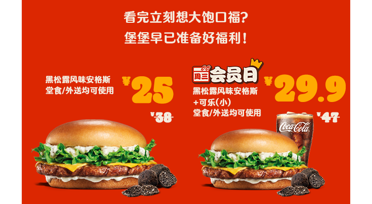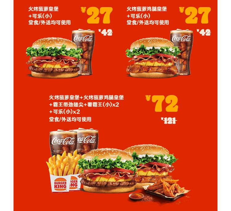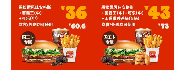 *非外卖渠道价格解释:图示如有划线价格,并非指原价,而是指不参加优惠活动情况下该产品在汉堡王指定门店销售的常规价格(或者指其中所含单品的常规单买价总和)或汉堡王门店建议零售价。除非图示另有解释,否则图示如有节省的金额或折扣比例,是与不参加优惠活动情况下在汉堡王指定门店单独购买该产品的常规价格(或者其中所含单品的常规单买价总和)或汉堡王门店建议零售价相比较。若需要查询当前门店销售的常规价格,可查看相应门店菜单或详询店员。