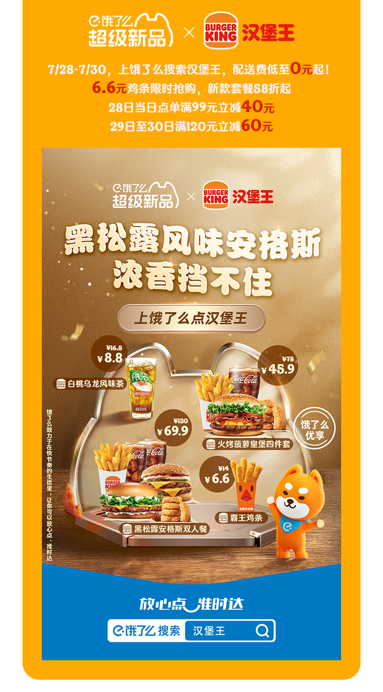*外卖渠道价格解释:图示如有划线价格,并非指原价,而是指不参加优惠活动情况下该产品在汉堡王外送销售的常规价格(或者指其中所含单品的常规单买价总和)或汉堡王外送建议零售价。除非图示另有解释,否则图示如有节省的金额或折扣比例,是与不参加优惠活动情况下在汉堡王外送单独购买该产品的常规价格(或者其中所含单品的常规单买价总和)或汉堡王外送建议零售价相比较。