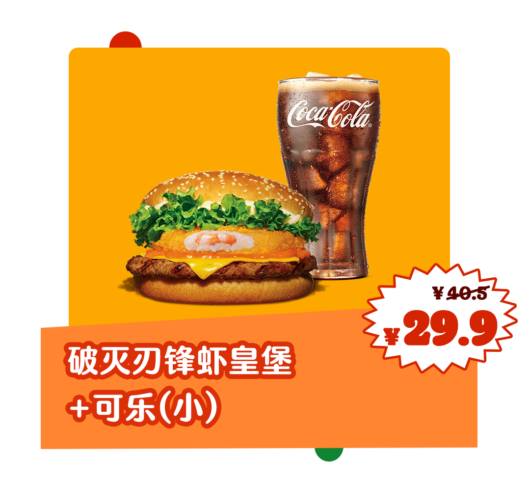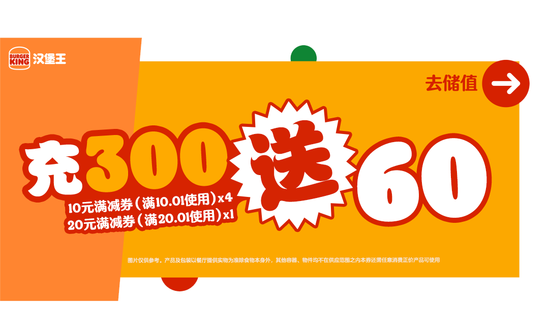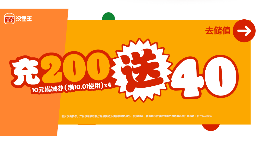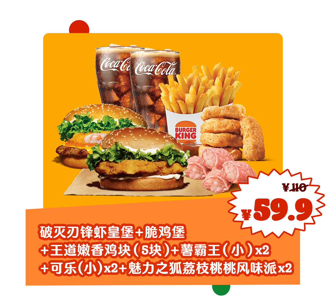 *非外卖渠道价格解释:图示如有划线价格,并非指原价,而是指不参加优惠活动情况下该产品在汉堡王指定门店销售的常规价格(或者指其中所含单品的常规单买价总和)或汉堡王门店建议零售价。除非图示另有解释,否则图示如有节省的金额或折扣比例,是与不参加优惠活动情况下在汉堡王指定门店单独购买该产品的常规价格(或者其中所含单品的常规单买价总和)或汉堡王门店建议零售价相比较。若需要查询当前门店销售的常规价格,可查看相应门店菜单或详询店员。