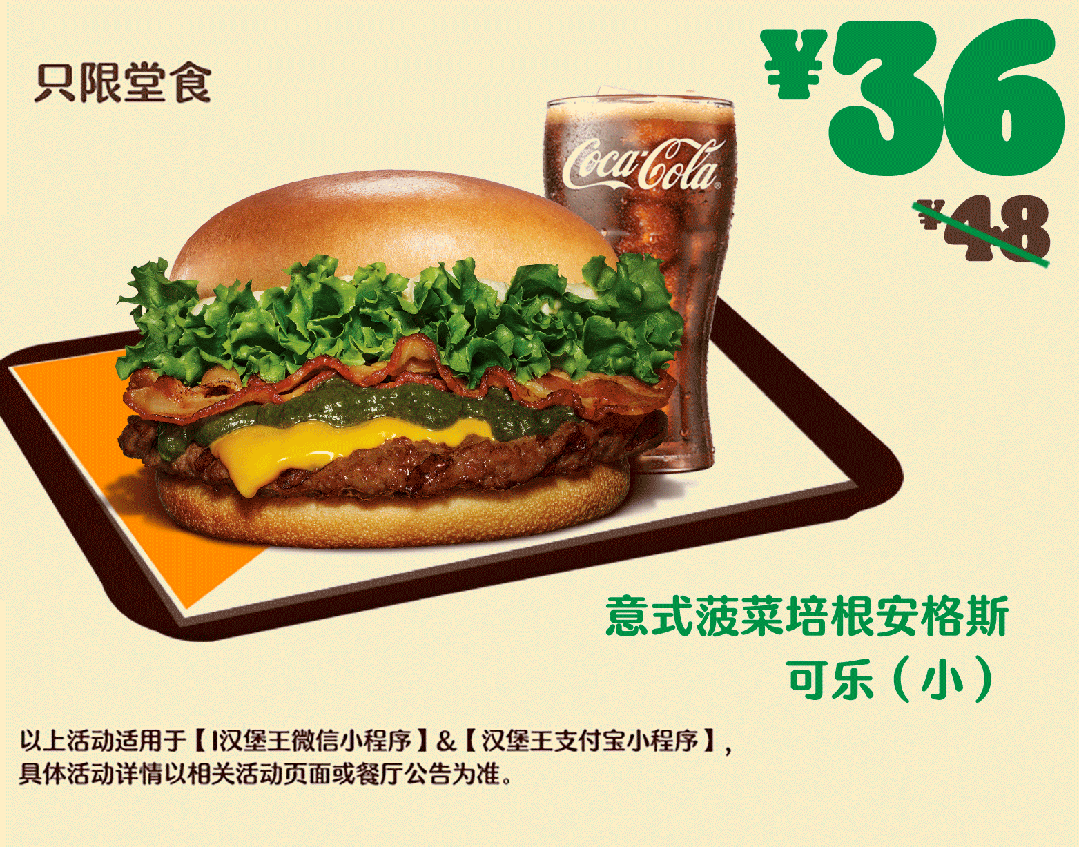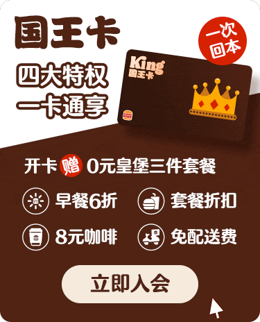 *非外卖渠道价格解释:图示如有划线价格,并非指原价,而是指不参加优惠活动情况下该产品在汉堡王指定门店销售的常规价格(或者指其中所含单品的常规单买价总和)或汉堡王门店建议零售价。除非图示另有解释,否则图示如有节省的金额或折扣比例,是与不参加优惠活动情况下在汉堡王指定门店单独购买该产品的常规价格(或者其中所含单品的常规单买价总和)或汉堡王门店建议零售价相比较。若需要查询当前门店销售的常规价格,可查看相应门店菜单或详询店员。