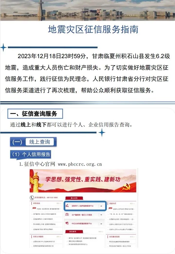加强灾区征信服务。制作地震灾区征信服务指南,强化征信服务引导。指导陇信通平台开辟“抗震救灾信贷产品绿色申请专区”,引导金融机构利用地方征信平台线上融资对接功能,提供高效融资服务。