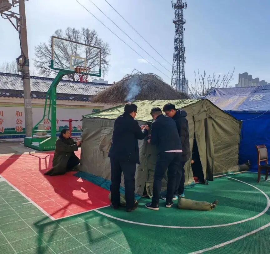 中国人民银行积石山县支行职工搭建救灾帐篷。