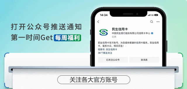 文章内容来源于公众号:民生信用卡 点此可查看原文。若涉及版权问题或存在侵权情况,请及时与我们联系,我们将第一时间进行删除处理。