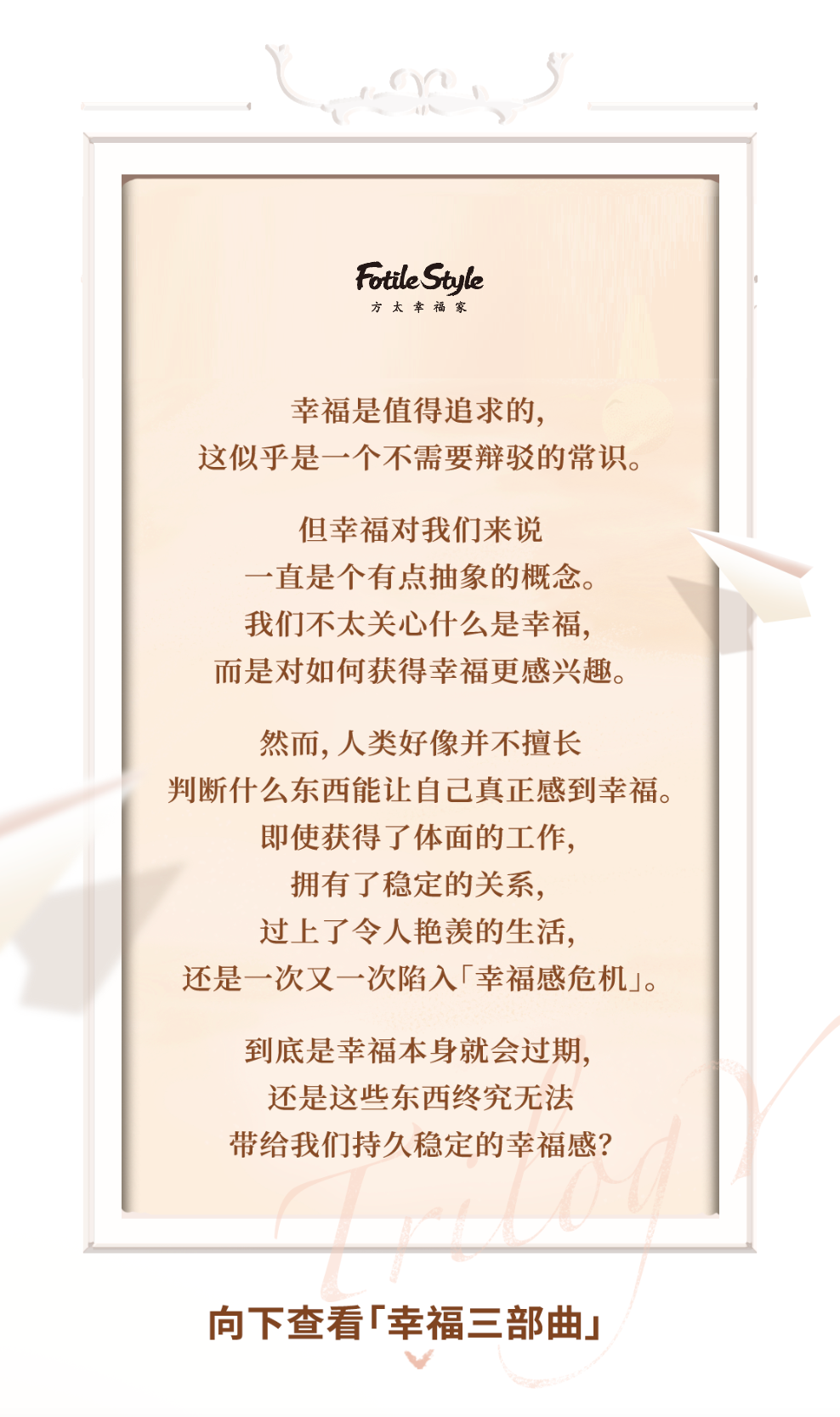 上面的三个故事,可能发生在每个人的身边。它们看似不同,但其实背后的问题又出奇的一致,那就是:为什么我所感受到的幸福总是很快就过期了?积极心理学将幸福定义为:一种以快乐、满意、满足和充实为特征的情感状态,由人们的主观感受来界定。心理学家进一步将评价幸福感的维度分为两种:一种叫做「认知幸福感(cognitive well-being)」,指的是从理性角度来看,对于生活的满意度。另一种叫做「情感幸福感」(affective well-being),指的是人们在日常生活中所体验到的微小的积极时刻。「认知幸福感」通常与成就和成功有关,比如考上名校、结婚、升职、买房等世俗意义上会让人感到幸福的事情。这些事情本身当然非常值得开心,但很遗憾的是,研究发现,这些「喜事」带来的幸福感是有保质期的。早在几十年前,心理学家Brickman等人通过对彩票中奖者的跟踪调查发现, 仅仅18个月过后,ta们的幸福感便与从来没有中过奖的人没有区别。同样,一项历经15年、关于婚姻幸福感的研究结果表明,人们在刚结婚时会感觉到幸福,但平均2年后就会完全习惯婚姻生活,幸福感回归到未婚状态(Diener et al., 2006)。也就是说,对于生活中的「喜事」,人们往往感觉兴奋、激动或幸福,但没过多久,这些积极情绪会淡化,最终回归初始状态。无论是让人感觉到多么快乐的事件,都会在2年左右形成一种「享乐适应(hedonic adaptation)」。享乐适应是情绪的适应过程,某种程度上来说这就像人类适应气味、温度及光线一样自然。享乐适应是研究幸福的一把钥匙,也被认为是人类获取长期幸福的最大障碍(Sheldon & Lyubomirsky, 2012)。因为很多时候,我们误以为幸福是令人满意的、有质量的生活,当我们将幸福的来源全部寄托于具有意义的里程碑事件而不是即时的快乐和满足时,我们会错过很多当下能获得的快乐。因此在积极心理学中,会强调幸福并不是来自于你所获得的某样东西,更多是一种动人的体验和经历。这些日常生活里动人的、微小的「积极时刻」,也就是「情感幸福感」,才是源源不断的幸福源泉。当我们评估一个人的情感幸福感时,又可以分为正向情感(爱、自尊、愉快、享受)和负向情感(比如沮丧、低落、不安)。在日常生活中我们把所体验到的正向情感和负向情感的差命名为「快乐感(happiness)」。换句话说,当一个人体验到的正向情感多于负面情绪时,我们会感觉到快乐,情感幸福感也会更高。相比于实现某个宏大目标带来的幸福感,有意识地品味(savoring)、享受积极经历和快乐时刻所带来的幸福感是不会过期的。当我们着眼于此时此刻、对美好事物有感知力,我们会意识到一个又一个当下的快乐拼凑在一起组成了一种持久稳定的幸福感。有时,能带给我们情感幸福感的小事或许转瞬即逝,但它所创造出的动人的体验却直接而真实,可能是:“Any man, who is a man, can travel alone.” (每一个人都可以独自旅行)这是纪录片《极寒之路》的开场,然而抵达这段极寒之路的尽头,在夕阳下,男主人公说:“Any man, who is a man, can travel alone. But I also realized that perhaps finish lines are better shared.” (每一个人都可以独自旅行,但最好的终点是有人可以分享的终点)。也许不只是极寒之路,人生各种路上,我们都会不禁感叹,如果有人同享,那就更好了!幸福的模样是在与人同享中的过程里,是在我们分享自己如何勇敢走上征途的时刻,更是这份勇气感染人的时刻。幸福听起来似乎是模糊的,但它其实就悄悄渗透在我们传递情绪价值的瞬间,也在我们接受情绪价值的瞬间。也就是说,幸福可能一直在那里,只是我们缺少了觉察与感知,才觉得幸福保质期总是太短,才误以为自己离幸福很远,好在幸福觉知力是可以在漫漫岁月中习得和提升的。提升自己的幸福觉知力,除了发现生活中的情感幸福感,可以从了解自己以及自己能为朋友们提供什么情绪价值开始。方太幸福家联合KnowYourself推出《积极情绪能量测试》,测测你最具感染力的积极情绪能量是什么,也可以邀请朋友测试,看看在可提供的情绪价值这件事上,你们有多投缘。像《沙丘》里说的:“就像人生的奥秘并不在于解决某个问题,而是去经历眼前的现实。”关于眼前的现实,关于触手可及的幸福,方太幸福家也想跟大家探讨。现在方太幸福家App全新上线测评中心,希望我们都能找到属于自己的幸福奥秘。在方太幸福家App(点我立即下载)探索你的幸福答案,下载App能查看完整版情绪价值解析,还能邀请好友一起做测试看看你们的默契度,以及谁是你默契度最高的好友,前10名的好友将会出现在你的榜单上哦!
