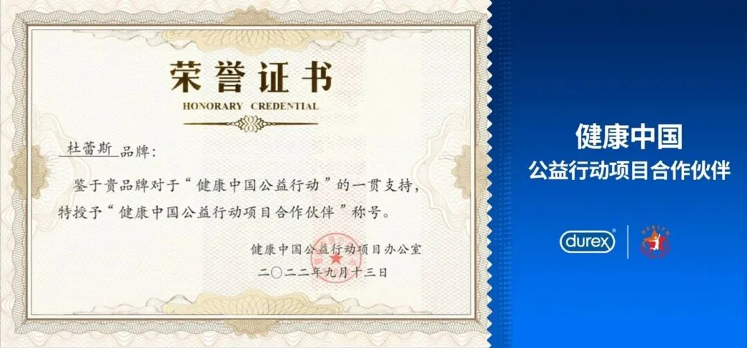 杜蕾斯品牌自2020年初,就以实际行动,在业内领先响应践行健康中国战略,加入了「健康中国」的公益项目。作为「健康中国行动公益项目的合作伙伴」,杜蕾斯品牌能与国家权威机构合作,并且获得认可,是对杜蕾斯品牌在公益事业上所作贡献的莫大肯定。