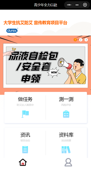 杜蕾斯品牌参与支持促进青年学生群体生殖健康、防治性传播疾病和艾滋病的咨询小程序开发。2021年7月,杜蕾斯「青少年全力以赴」官方小程序正式上线,通过丰富的专业科普内容、专家咨询、知识问答和尿液自检包申领等形式,强化青年学生自我保护意识,促进高危学生主动检测筛查,助力完善艾滋病防治链条。截至2022年11月,已有10余万人次使用该小程序,同时,收回「大学生艾滋病知识、行为、自检需求调查」问卷达12万余份。