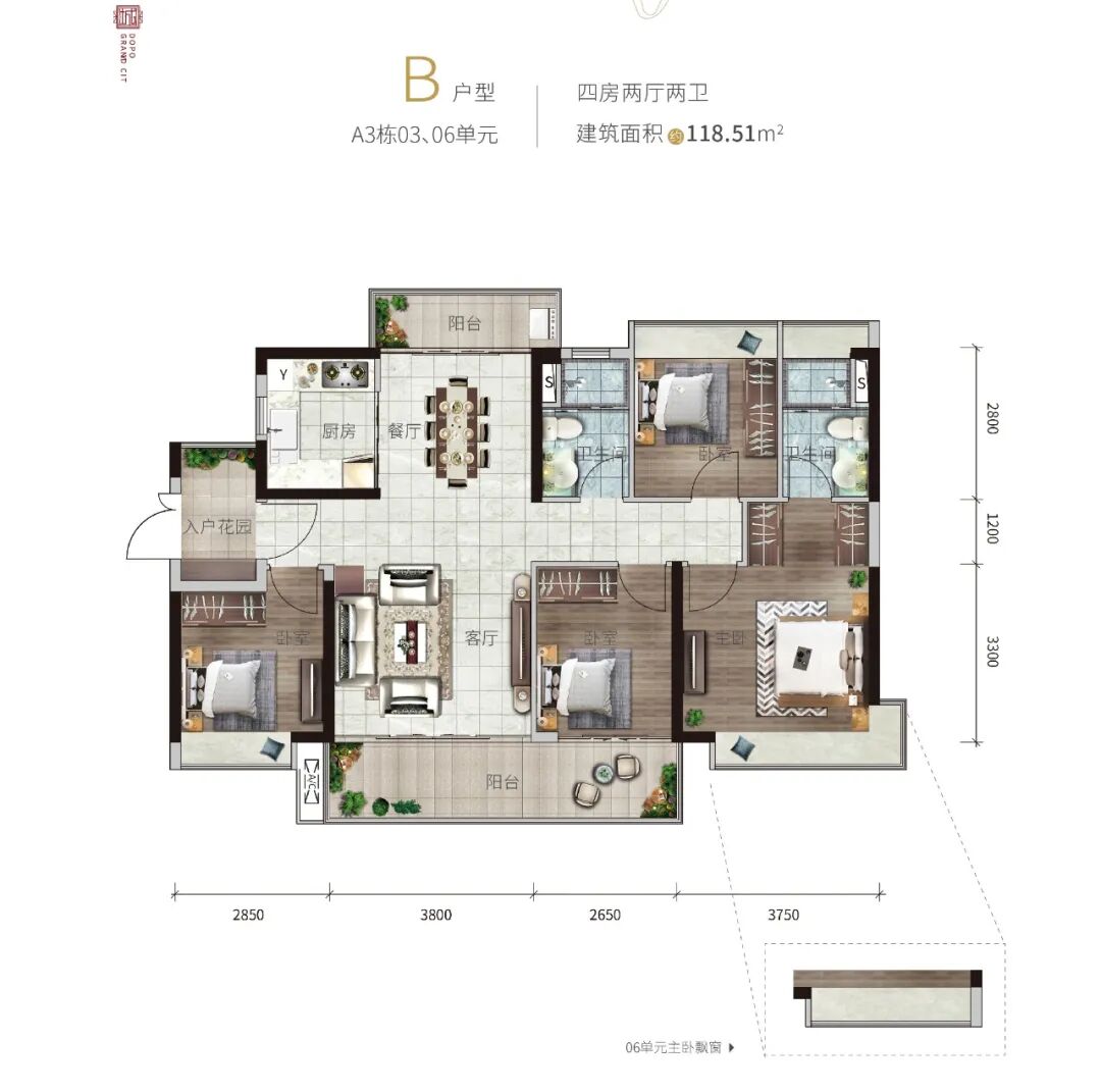 南向120平方米的四房户型采光通风极佳