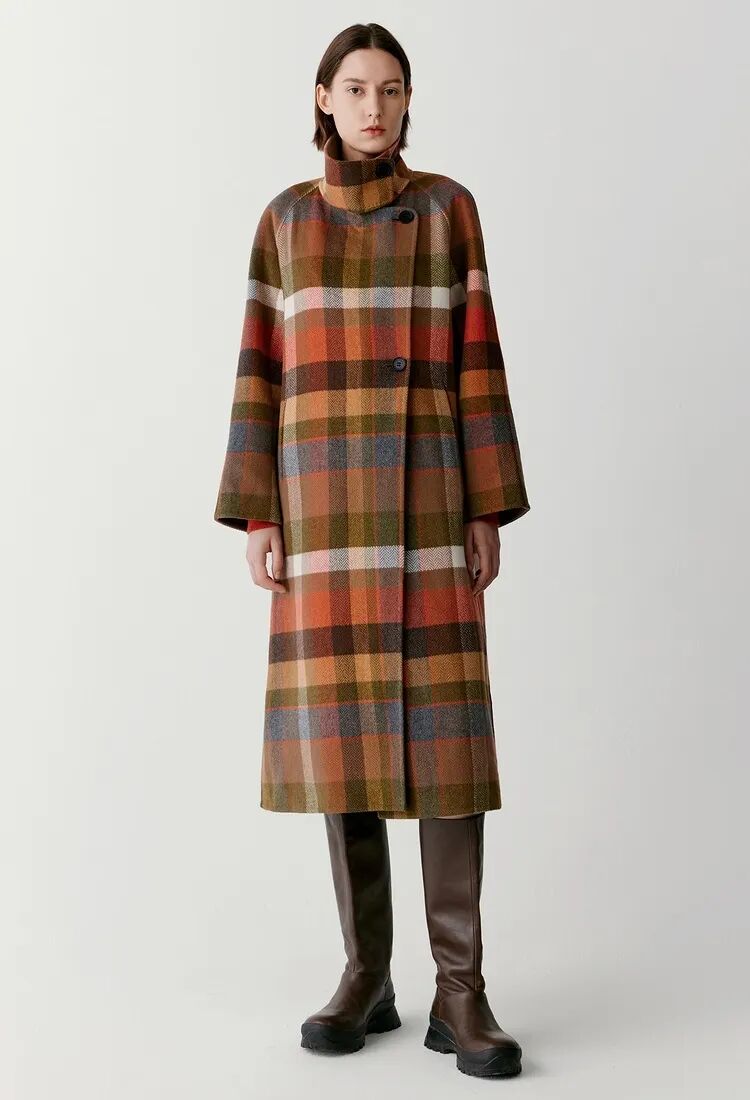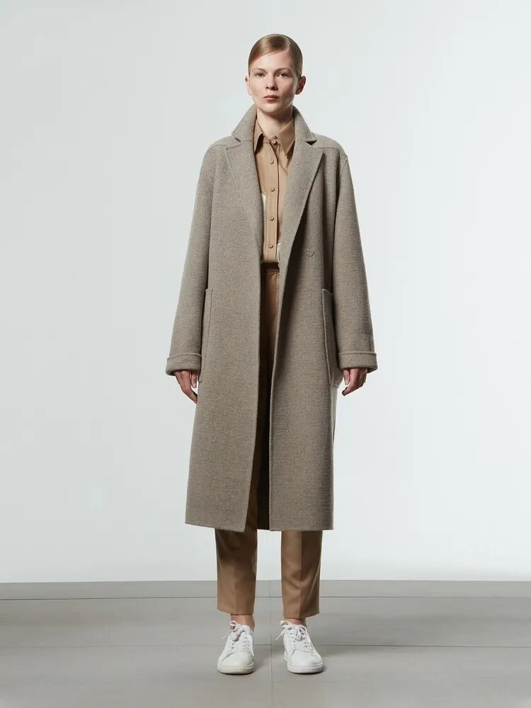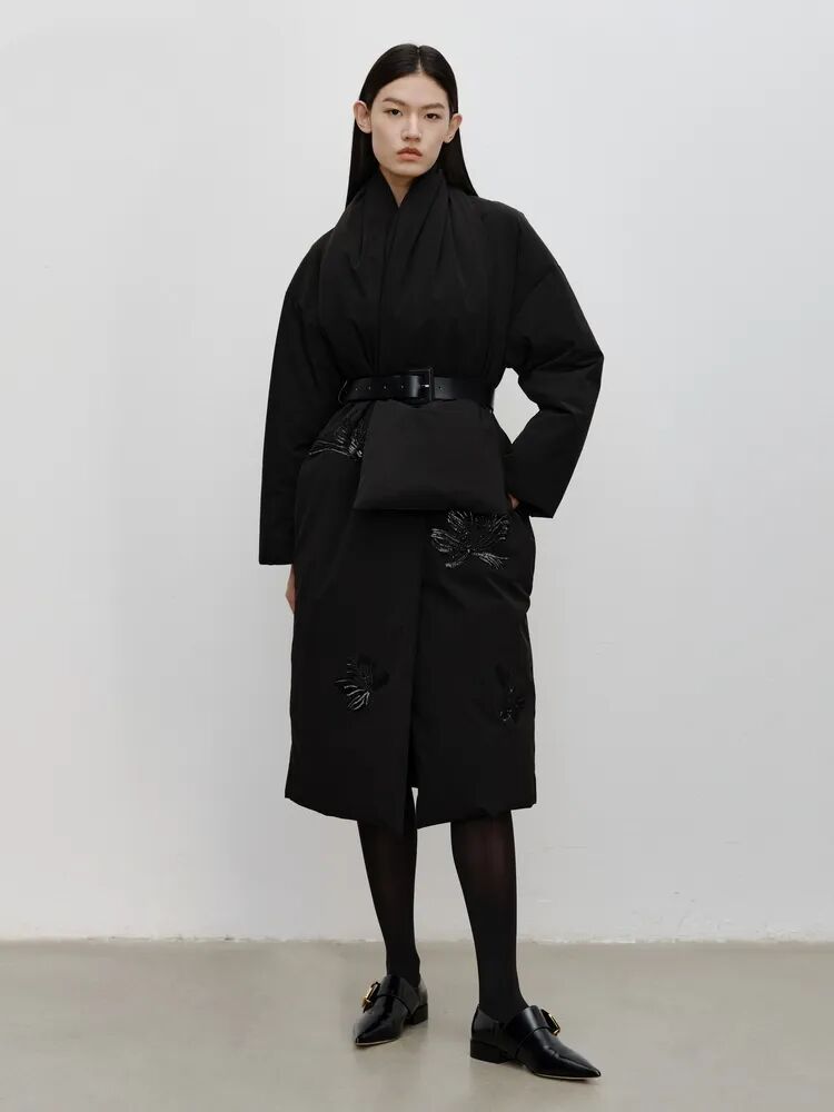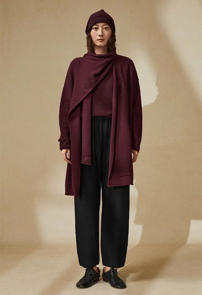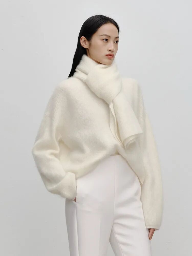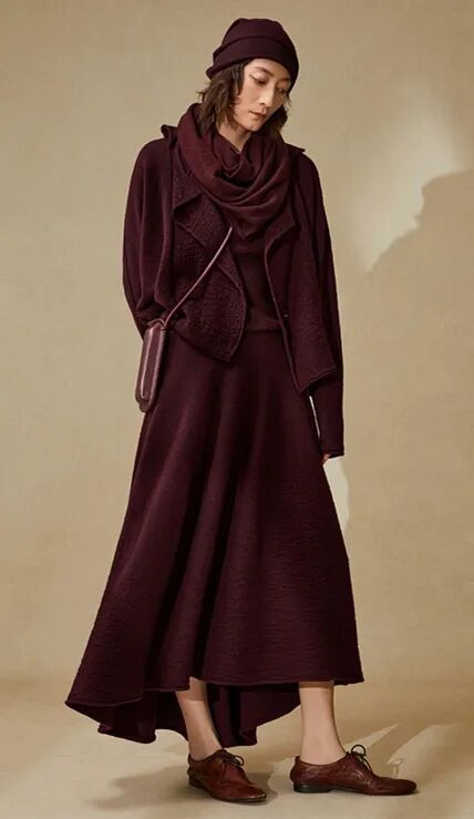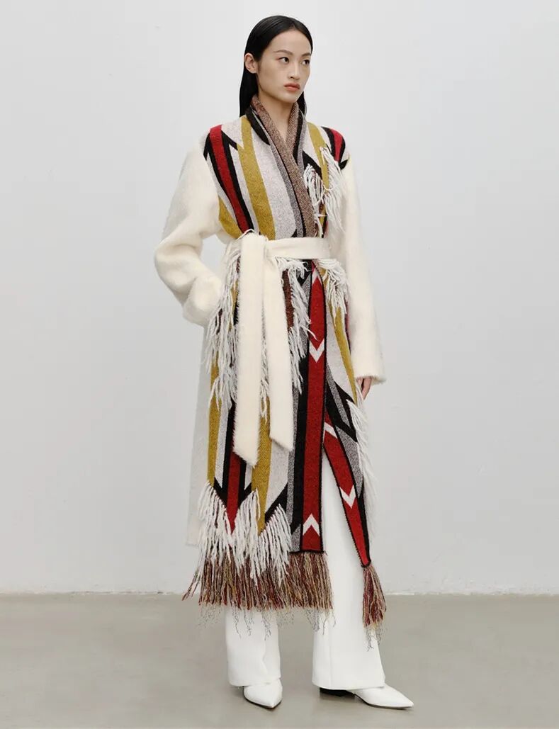 巧妙使用针织织片与梭织面料拼接而成,色彩靓丽、暖意融融。白色苏丽羊驼毛腰带可随心系在腰部,从视觉上拉长下半身的比例,彰显大气,更加突出面料的质感与肌理。