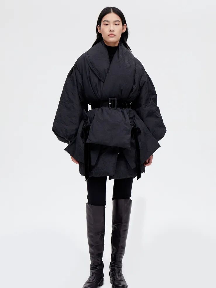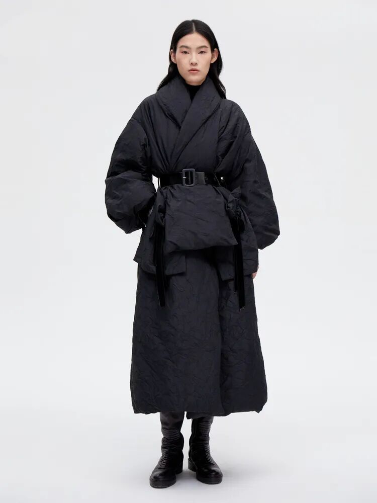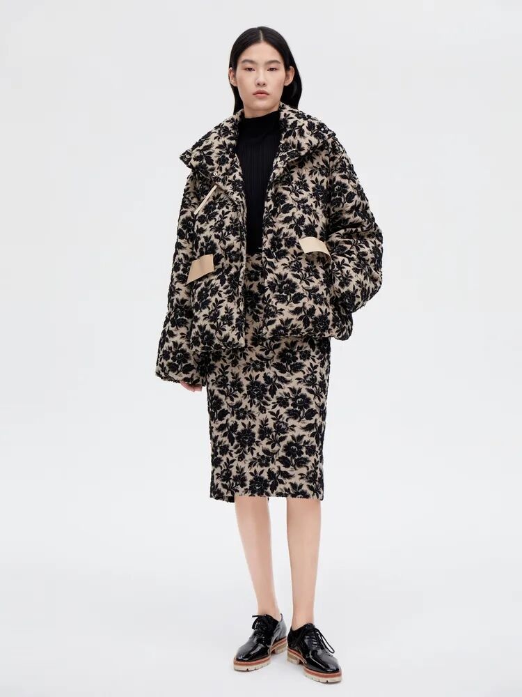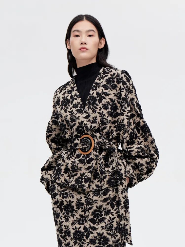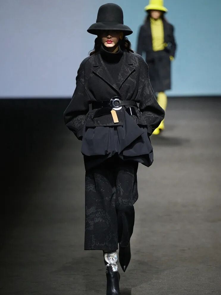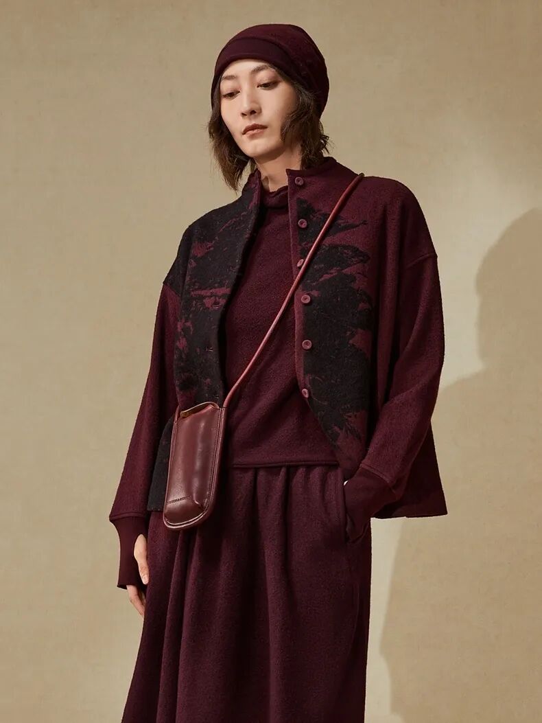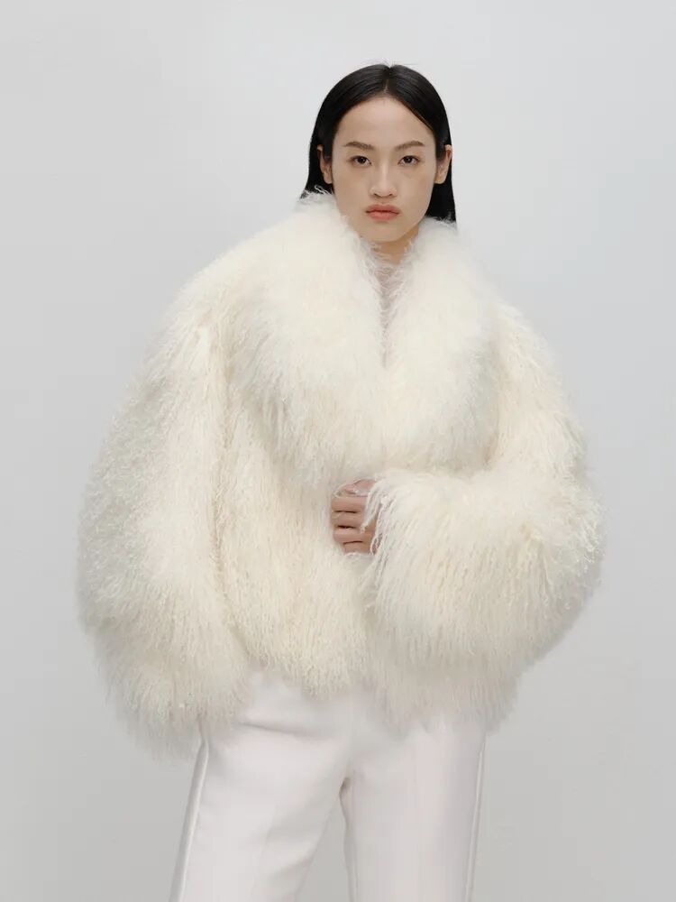 巧妙使用针织织片与梭织面料拼接而成,色彩靓丽、暖意融融。白色苏丽羊驼毛腰带可随心系在腰部,从视觉上拉长下半身的比例,彰显大气,更加突出面料的质感与肌理。