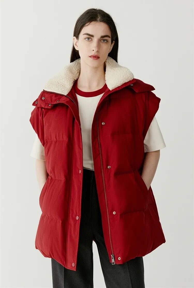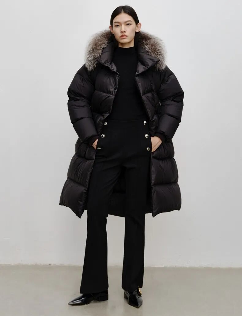 此款狐狸毛领羽绒服采用轻薄超柔面料,无胆布设计,减轻穿着负担。大身填充饱满的白鹅绒,侧插袋采用黑色亮PU装饰袋盖装饰,更凸显质感。