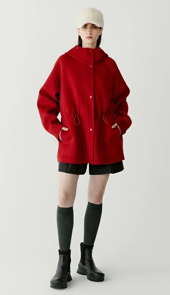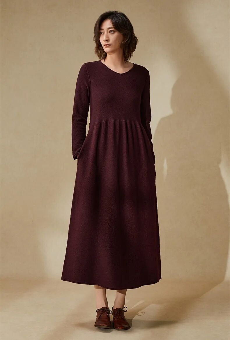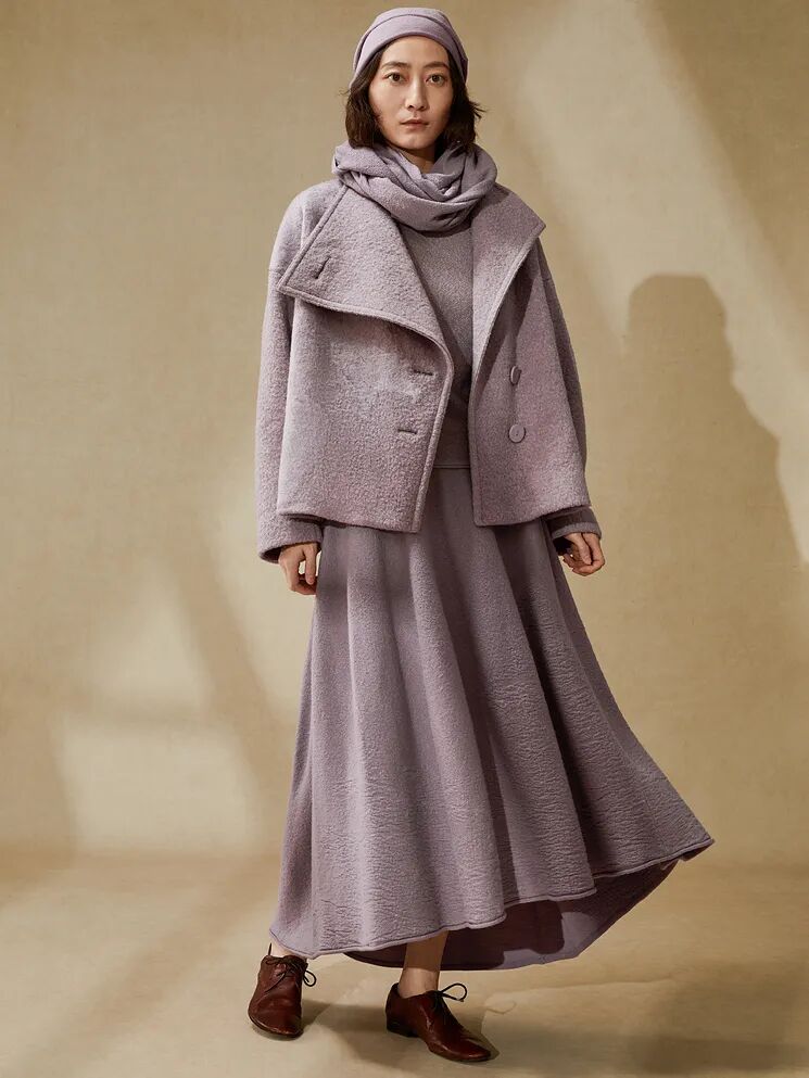 选用进口优质美丽诺羊毛原料与缩绒羊毛混织,手感柔软温暖,V领造型优雅好搭配,连衣裙可做内搭裙叠穿,也可单独穿着。腰节位置采用了缩针工艺,将腰臀差量转换为自然细碎的褶皱。