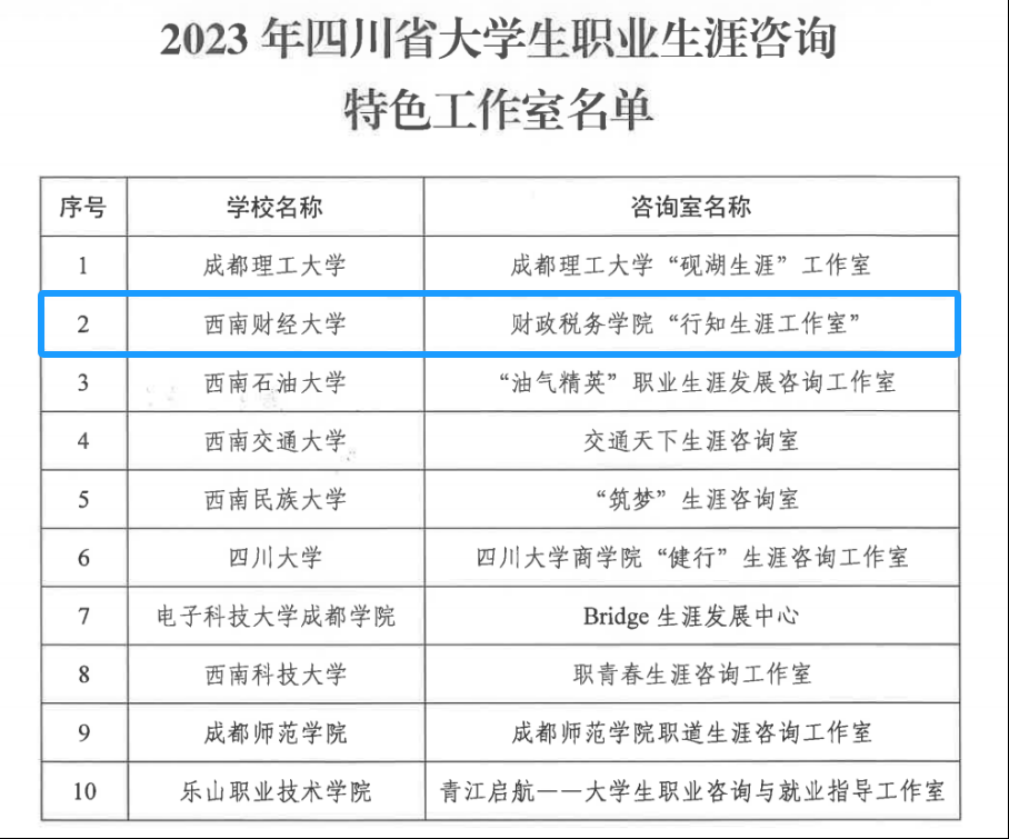 近日,四川省教育厅、四川省人力资源和社会保障厅公布了2023年四川省大学生职业生涯咨询特色工作室评选结果,我校财政税务学院行知生涯工作室入选。全省高校64个职业生涯咨询室参评。