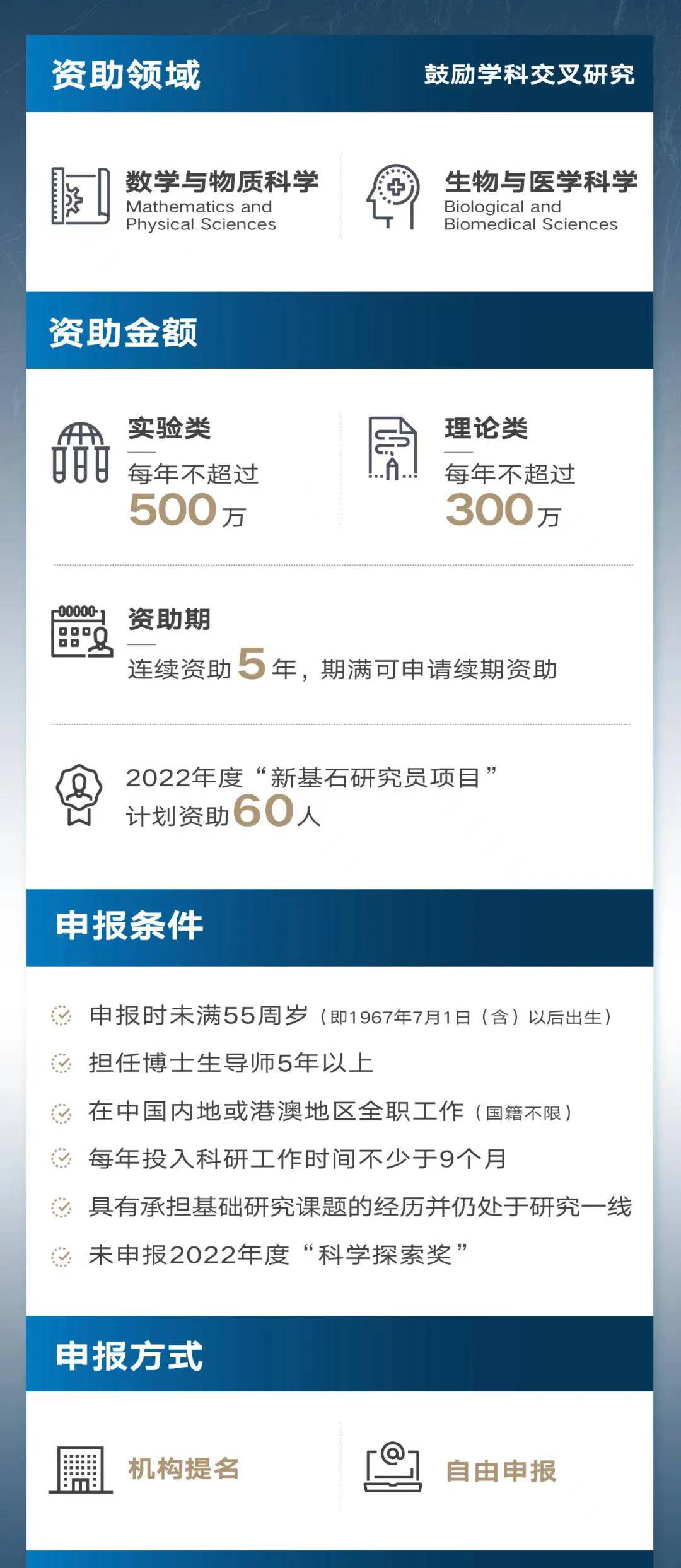 “新基石研究员项目”设置数学与物质科学、生物与医学科学两个领域,并鼓励学科交叉研究。资助类别分为两类:实验类不超过500万元每人每年,理论类不超过300万元每人每年,并连续资助5年。