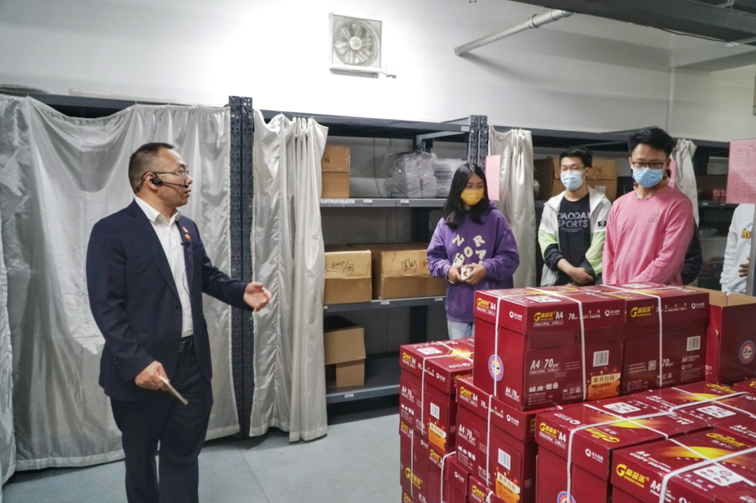 在中关新园,同学们在张明跃的带领,走进库房。从奥运会乒乓球赛馆里的数码相机到每餐饭的食材,从疫情暴发后的防疫物资到校园建筑内的公共设施,中关新园里大大小小的每一个角落,都和张明跃的工作息息相关。