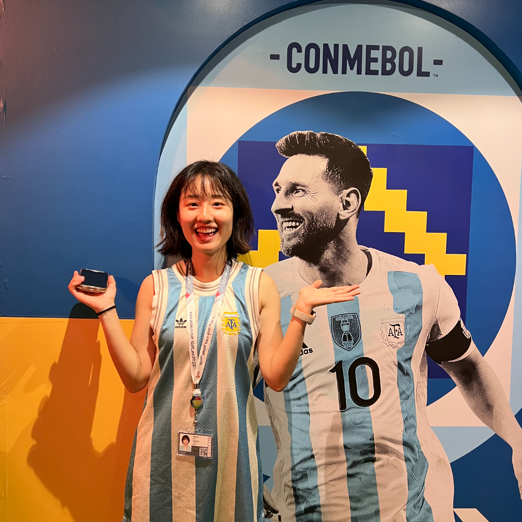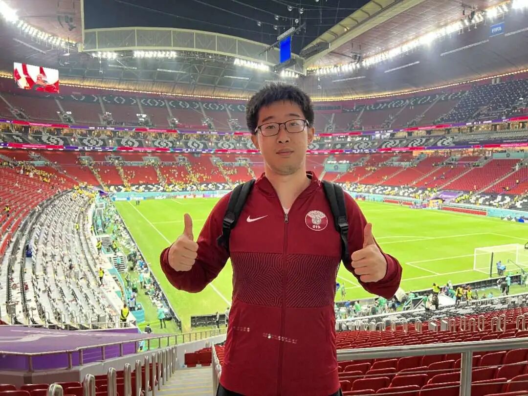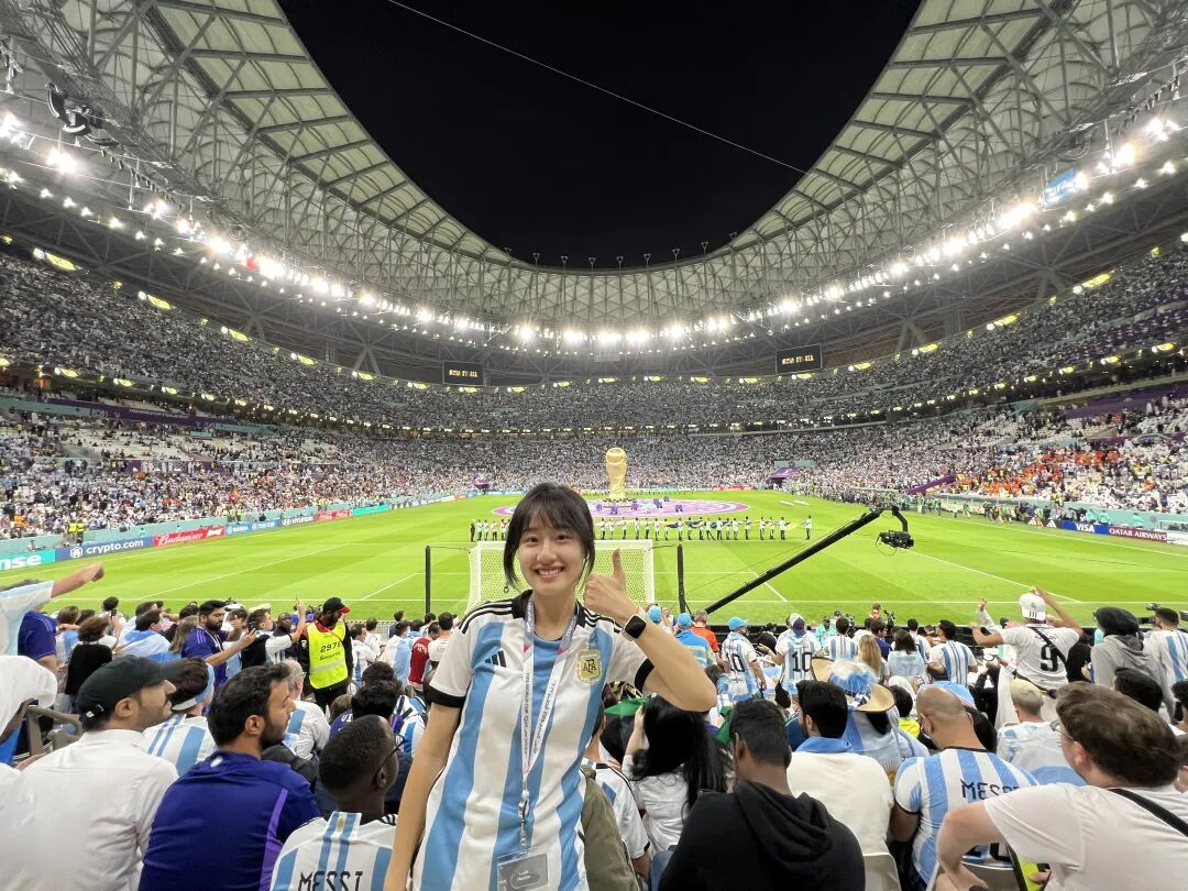 毕业之后,我走上了体育和足球这条道路,目前从事这方面工作已经七年多了。今年,在我经历的第六届世界杯上,我也终于有机会以组委会官方中文社交媒体工作人员的身份亲临卡塔尔现场,最近距离地体验世界杯的氛围。我现场看了六场比赛,在卡塔尔的球场外和球迷嘉年华做直播,感受了全世界球迷的热情,一次又一次感叹足球不愧是世界第一运动……