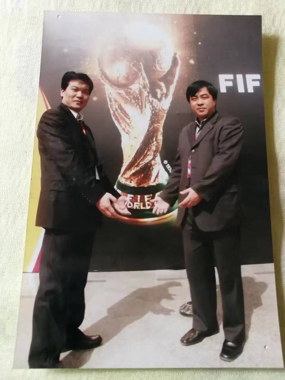 2002年,国际足联世界杯巡展活动——“大力神杯”来到北大。李杰老师(右一)与原北京大学体育教研部主任郝光安教授。