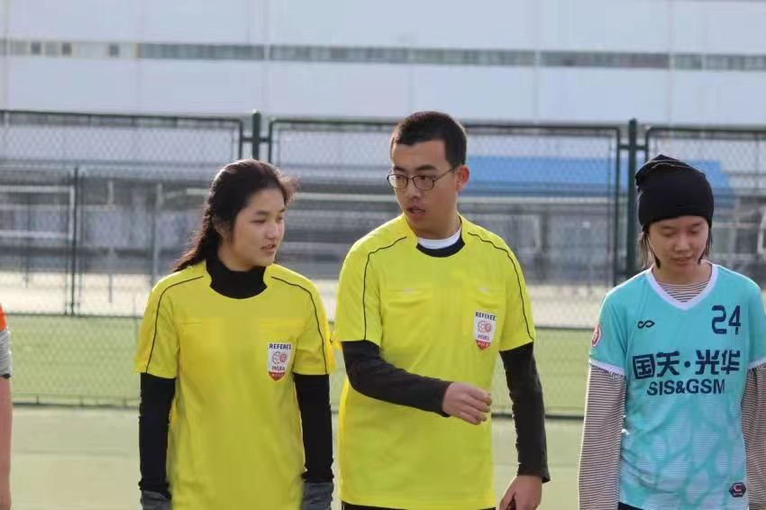 刘航(左一)在北大足协担任裁判