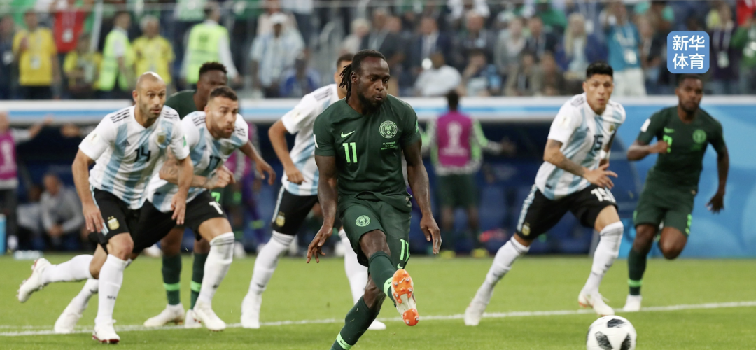 2018年6月26日,D组末轮阿根廷VS尼日利亚,下半场开场不久尼日利亚获得点球,摩西主罚命中扳平比分。(图源:新华社-新华体育)