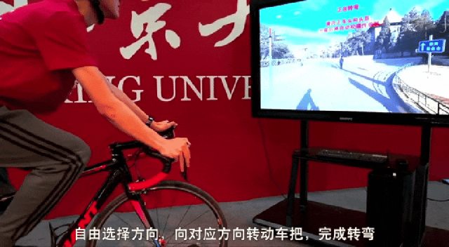 VR游戏项目,则是一个让人在一个骑行台上模拟在一个现实区域中自由骑行的装置。通过头盔和车把的传感器,以及踏频快慢,就可以模拟用户在校园里骑行,实现加速减速,转头观察,以及转动车把选择方向,以北大的真实风景为依托,把自行车游览的真实情况VR游戏中予以呈现,从而做成一套完整的系统。让用户建立安全情景意识,通过虚拟现实来改变可能招致危险发生的惯性思维,这是他们所展望的前景。