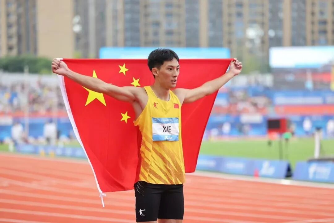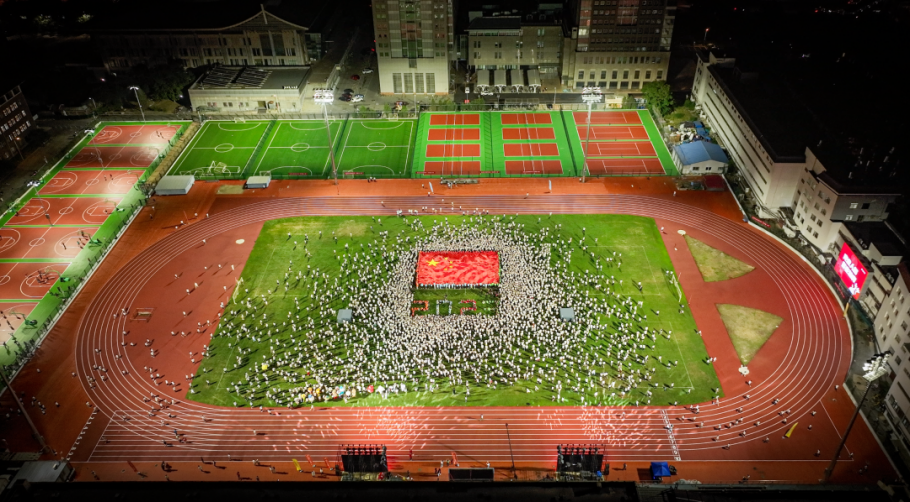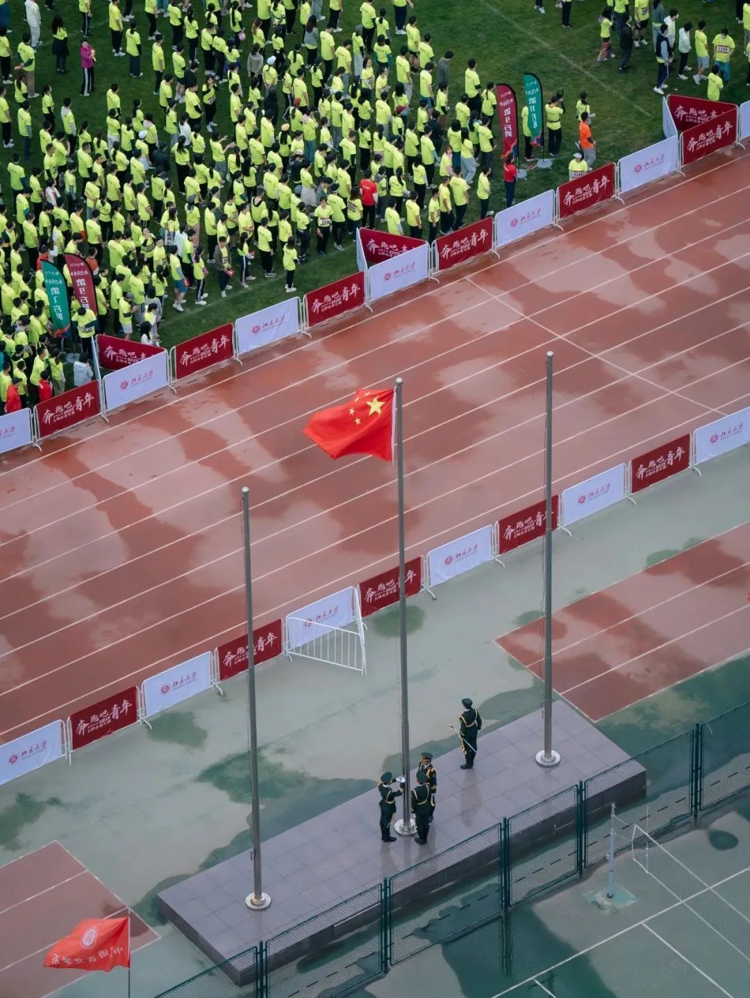 青年以奔跑的舒展姿态抒发爱国、爱校之情