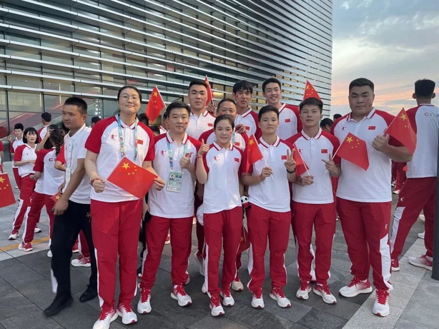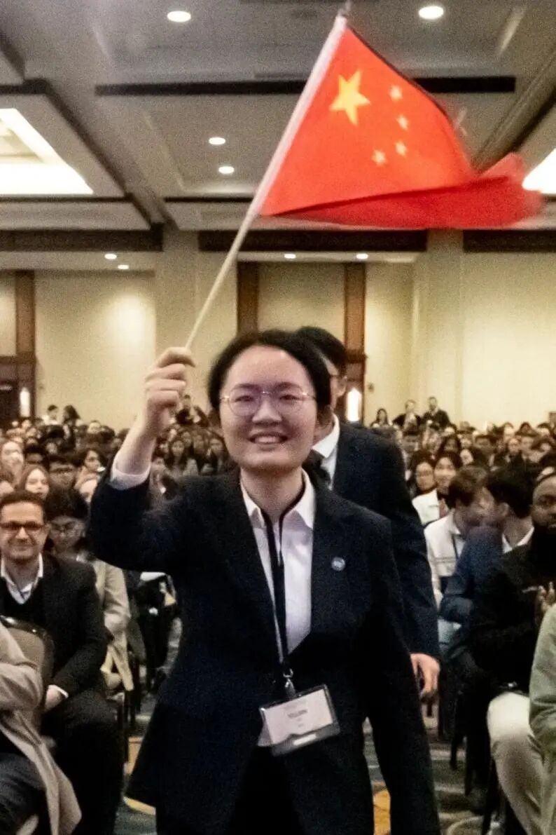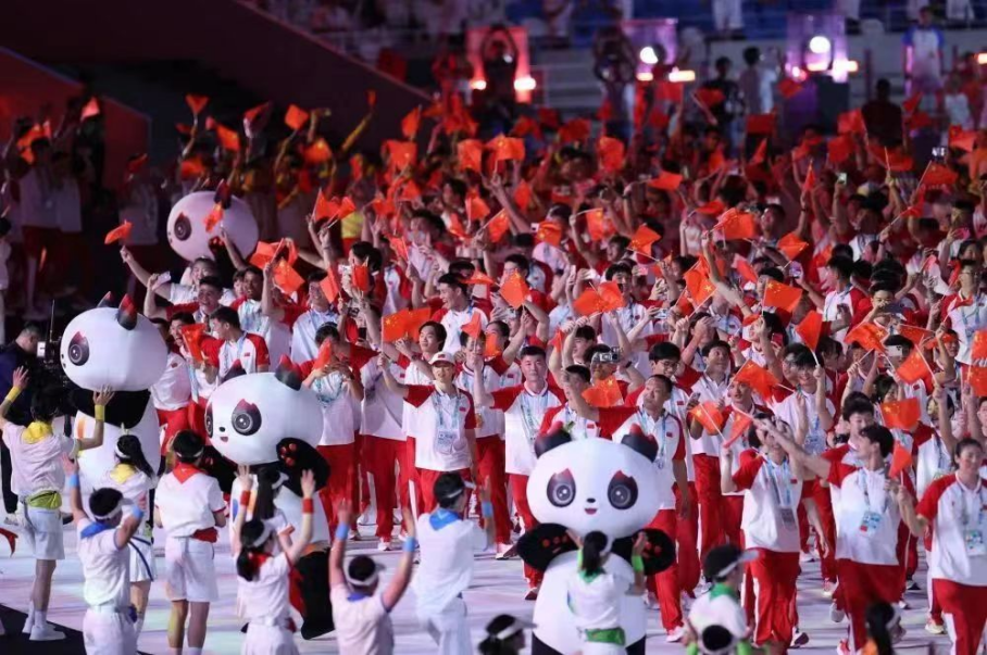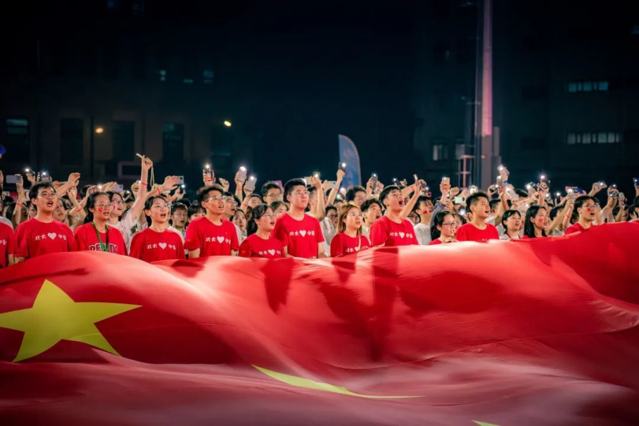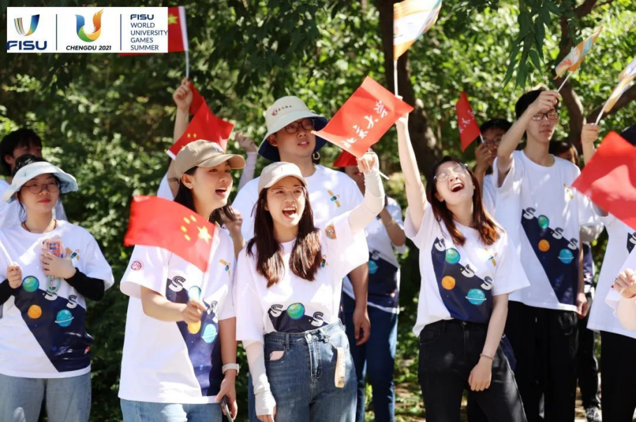 北大同学们挥舞着国旗、大运会会旗、校旗