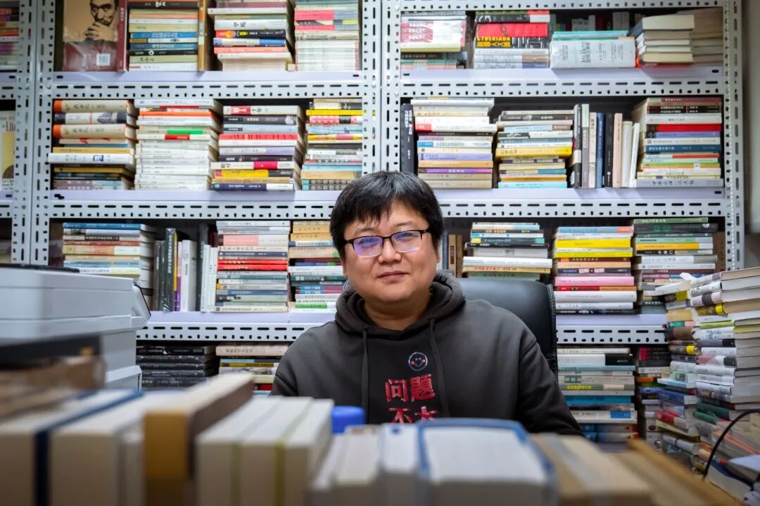 门口几个书架横纵摆放,使得方方正正的办公室平添一种曲折的迷宫氛围,从办公桌上到办公桌下,从桌前的沙发到桌后一整面“书墙”,都挤满了门类各异、色彩斑斓的书籍和期刊,以至于他不得不耗费一番精力腾开几摞书,方使来访者有坐下的位置。在这个书的世界里,时间似乎停滞了。