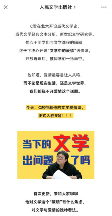 因此,在开通B站账号之初,C君对它的定位很清楚:用一种“不是不专业”但又“不完全是学术黑话”的方式讲述文学、分析文学,使每个人都能与文学建立联系,满足每一个普通人对文学的需求。