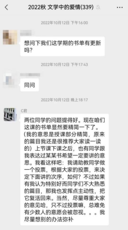 课程赏读作品选哪些篇目,也从同学们切身感受中来。在那个产生开课想法课程的结尾,C君邀请同学们写下各自最喜欢的与爱情有关的文学作品,经过统计和筛选,便有了第一次开课最初的讲授篇目。随着课程进行,C君不时在课上询问着大家的想法,偶尔也会进行小范围的增删。