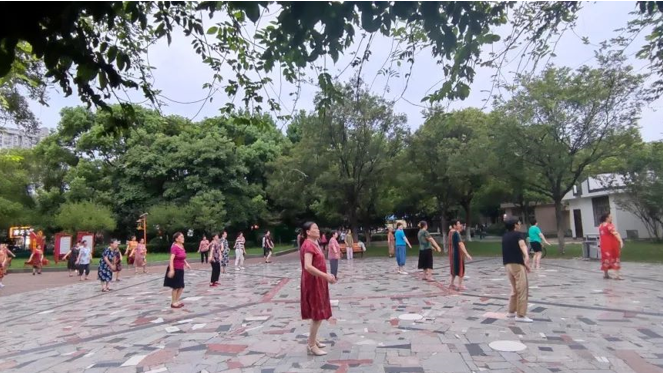 在澄江街道天鹤社区的公园看广场舞表演,大概是让周姜宏、卢宏轩和熊子阳三位同学印象颇为深刻的经历。