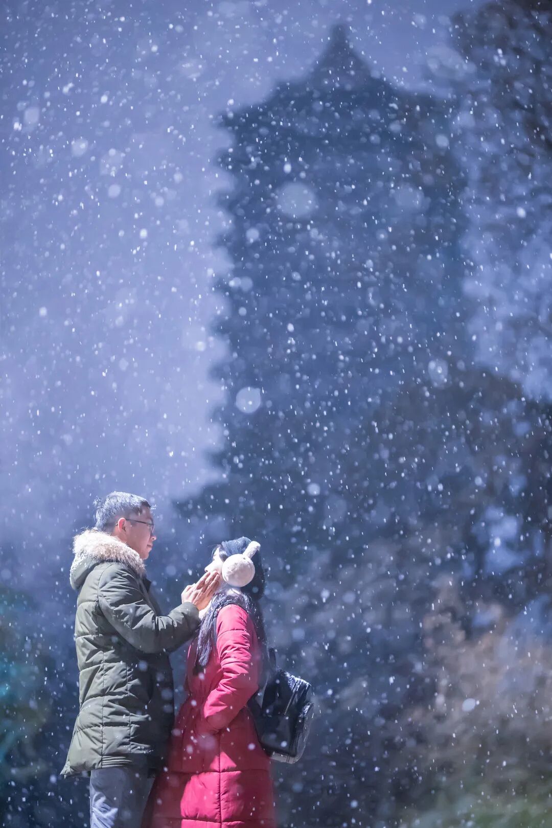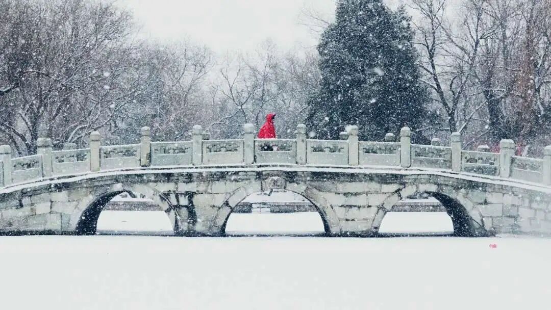 最后,我们在湖边寻到一盏恰到好处的路灯,哆哆嗦嗦地换了四次镜头后,终于拍下了这张与博雅塔的雪中合影。