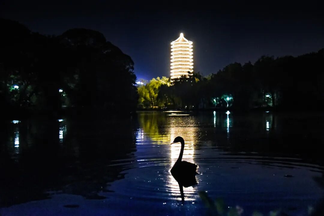摄于2018年5月30日,一只黑天鹅从圆明园飞来学校短暂定居,一日恰逢博雅塔亮灯,湖光、灯影、黑天鹅与燕园,成为了无可复制的完美童话。