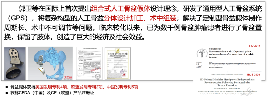 郭卫教授专攻骨肿瘤领域 20年,在大段骨关节缺损修复重建方面进行了一系列的开创性工作。他研发的“通用骨盆假体系统(Global Pelvic System,GPS)”获得美国、欧洲及中国多项专利并成功转化临床,“经腰椎固定半骨盆假体” 使得半侧骨盆切除的患者得以进行保肢治疗,并在国际上首创3D打印人工骶骨假体重建全骶骨切除后腰髂部稳定性。他还设计研发了“双轴型人工膝关节”、“仿生型儿童全膝关节”等多种关节假体,设计使用3D打印人工假体重建大段骨缺损。他首创多种新术式,使得90%以上的患者告别残酷的截肢手术,为数万例患者保留了肢体、恢复了功能,显著提高了患者生活质量,减轻了家庭和社会负担。