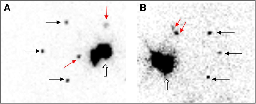 99mTc-美罗华用于乳腺癌前哨淋巴结显像,白色箭头:注射点;黑色箭头:参照位点;红色箭头:前哨淋巴结