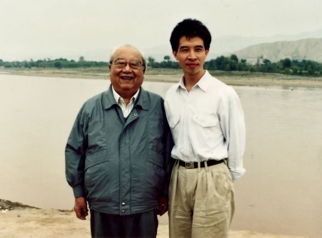△1992年秋,邱泽奇与费孝通先生摄于调研途中(甘肃省景泰县黄河边)